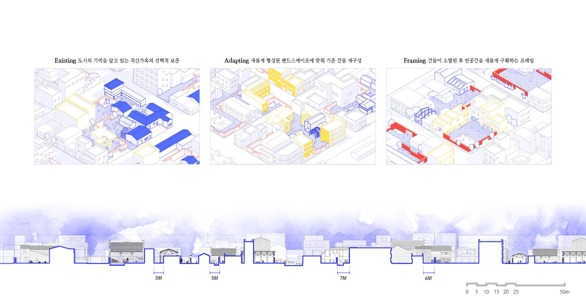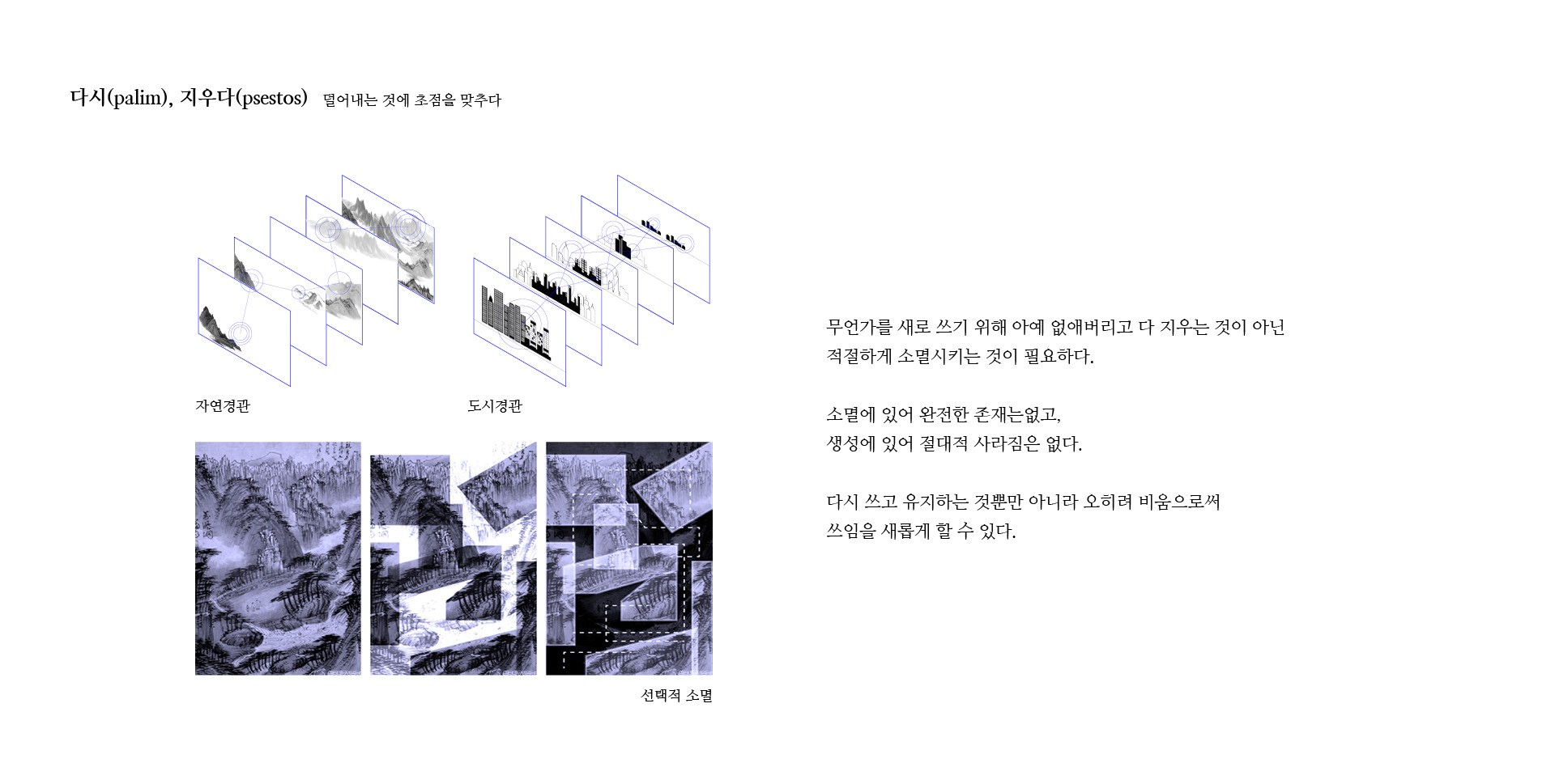 도시의 흔적을 따라 어느 부분을 덜어내고, 어느 부분을 보존할지 조절하는 Palimpsest. 다시, 지우는 소멸디자인을 제안한다.