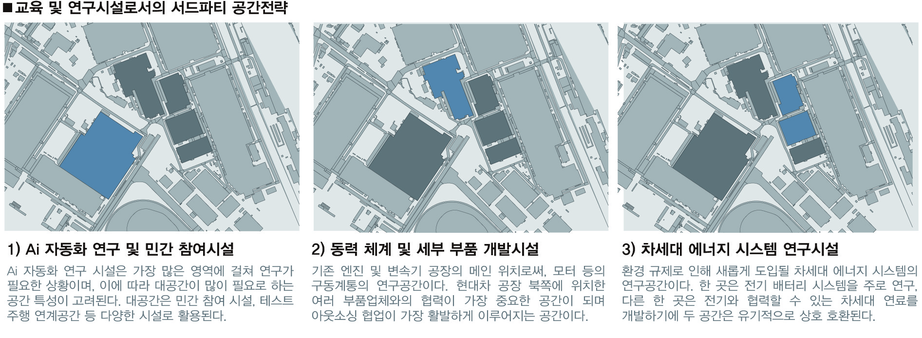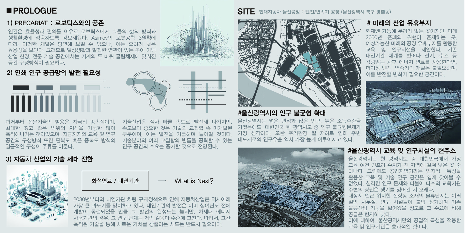 위 상황을 바탕으로, 기존 제조공정의 컨베이어벨트 방식의 원-웨이(One Way)시스템을 벗어나, 널리 퍼진 각 연구분야를 더 유기적이고 긴밀하게 협력할 수 있는 수평중심적 미래산업 교육/연구시설을 제안하고자 한다. 현 세계 최대 규모의 단일공장인 현대자동차 울산공장은 주변에 여러 협력 인프라가 많이 분포해 있는 등, 그 자체로의 경쟁력은 상당하다. 이와 더불어 울산주민들의 관련 교육수요도 꽤 높다는 점을 고려한다면, 울산광역시만이 가진 새로운 복합산업시설을 정립하여 지역경쟁력을 강화, 현 울산광역시가 겪는 인구불균형등의 문제도 해결할 수 있을 것으로 판단된다.