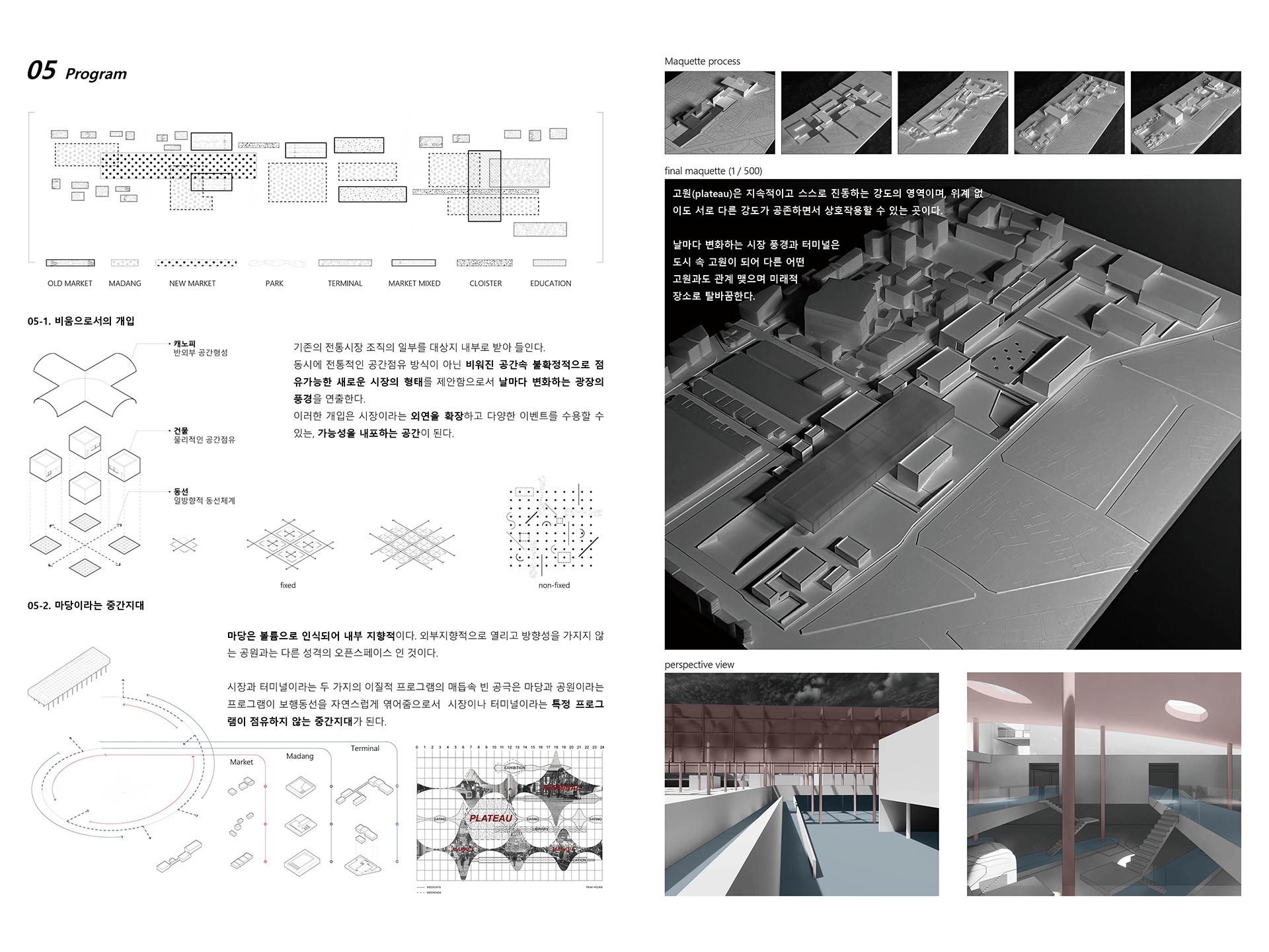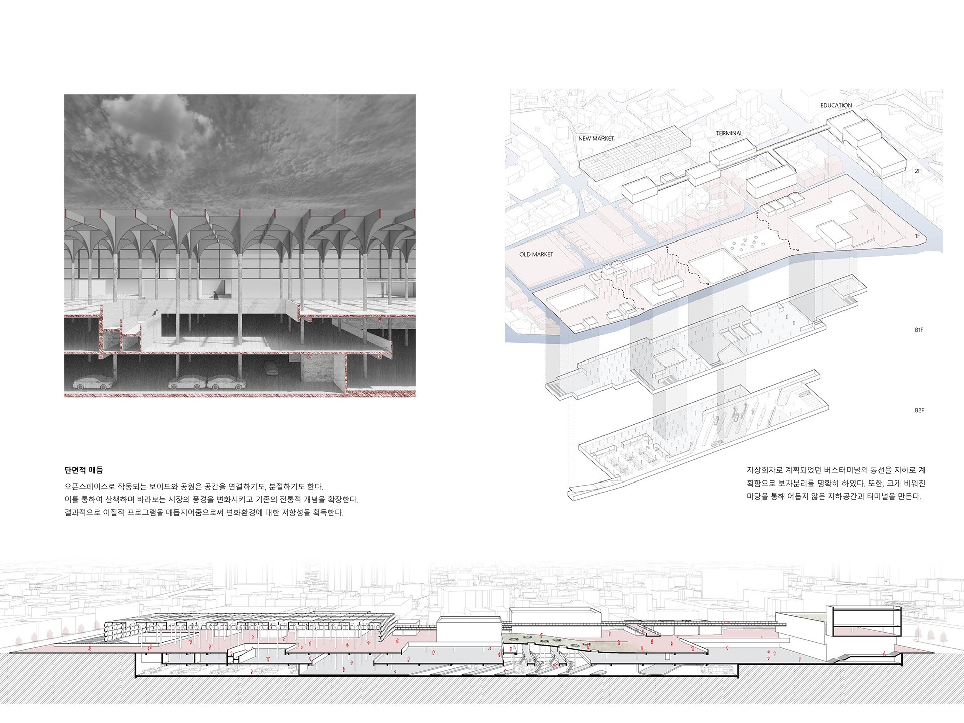 시장과 터미널이라는 두 가지의 이질적 프로그램의 매듭속 빈 공극은 마당과 공원이라는 프로그램이 보행동선을 자연스럽게 엮어줌으로서 시장이나 터미널이라는 특정 프로그램이 점유하지 않는 중간지대가 된다.