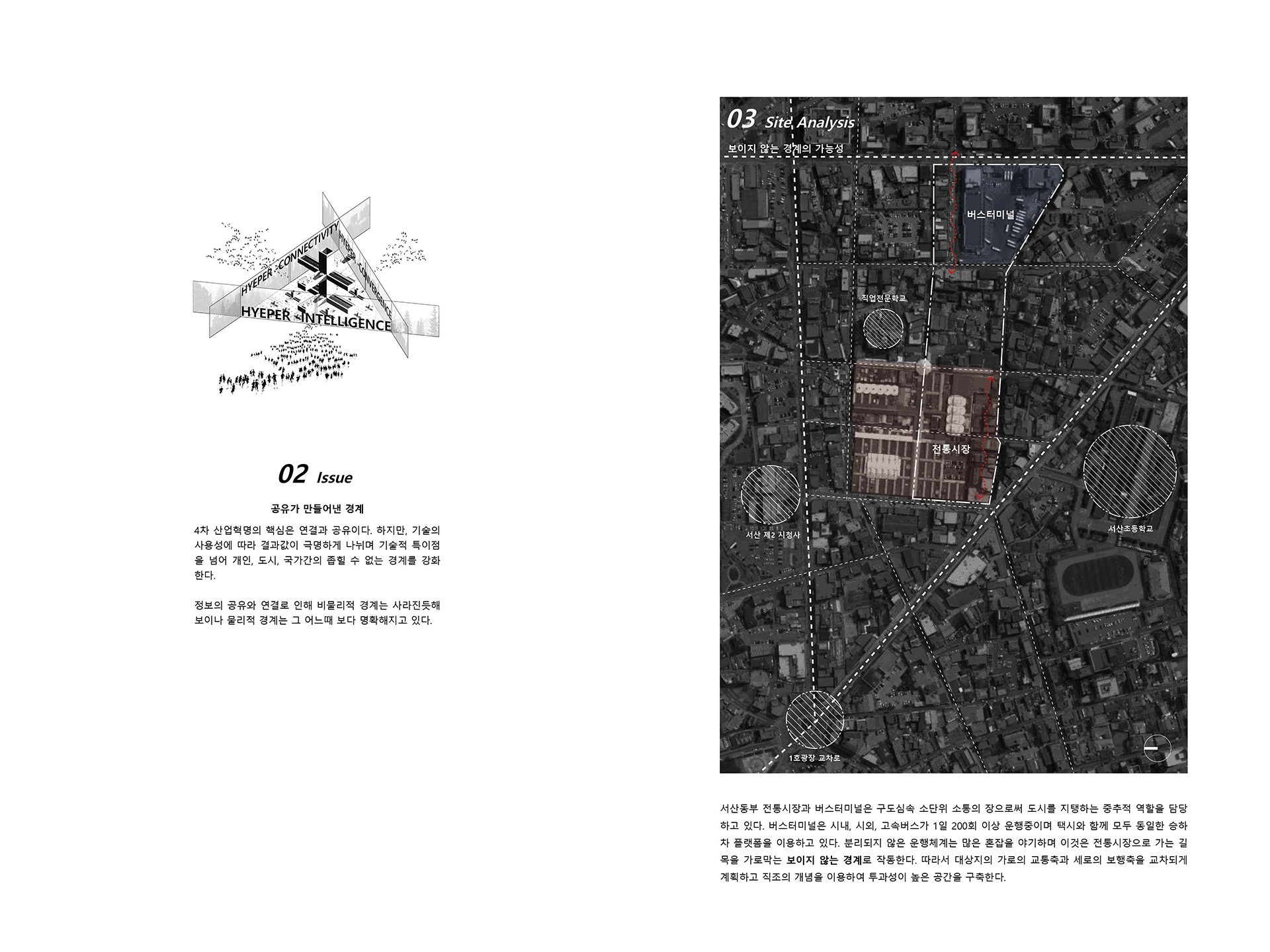 서산동부 전통시장과 버스터미널은 구도심속 소단위 소통의 장으로써 도시를 지탱하는 중추적 역할을 담당하고 있다. 버스터미널은 시내, 시외, 고속버스가 1일 200회 이상 운행중이며 택시와 함께 모두 동일한 승하차 플랫폼을 이용하고 있다. 분리되지 않은 운행체계는 많은 혼잡을 야기하며 이것은 전통시장으로 가는 길목을 가로막는 보이지 않는 경계로 작동한다. 따라서 대상지의 가로의 교통축과 세로의 보행축을 교차되게 계획하고 직조의 개념을 이용하여 투과성이 높은 공간을 구축한다.