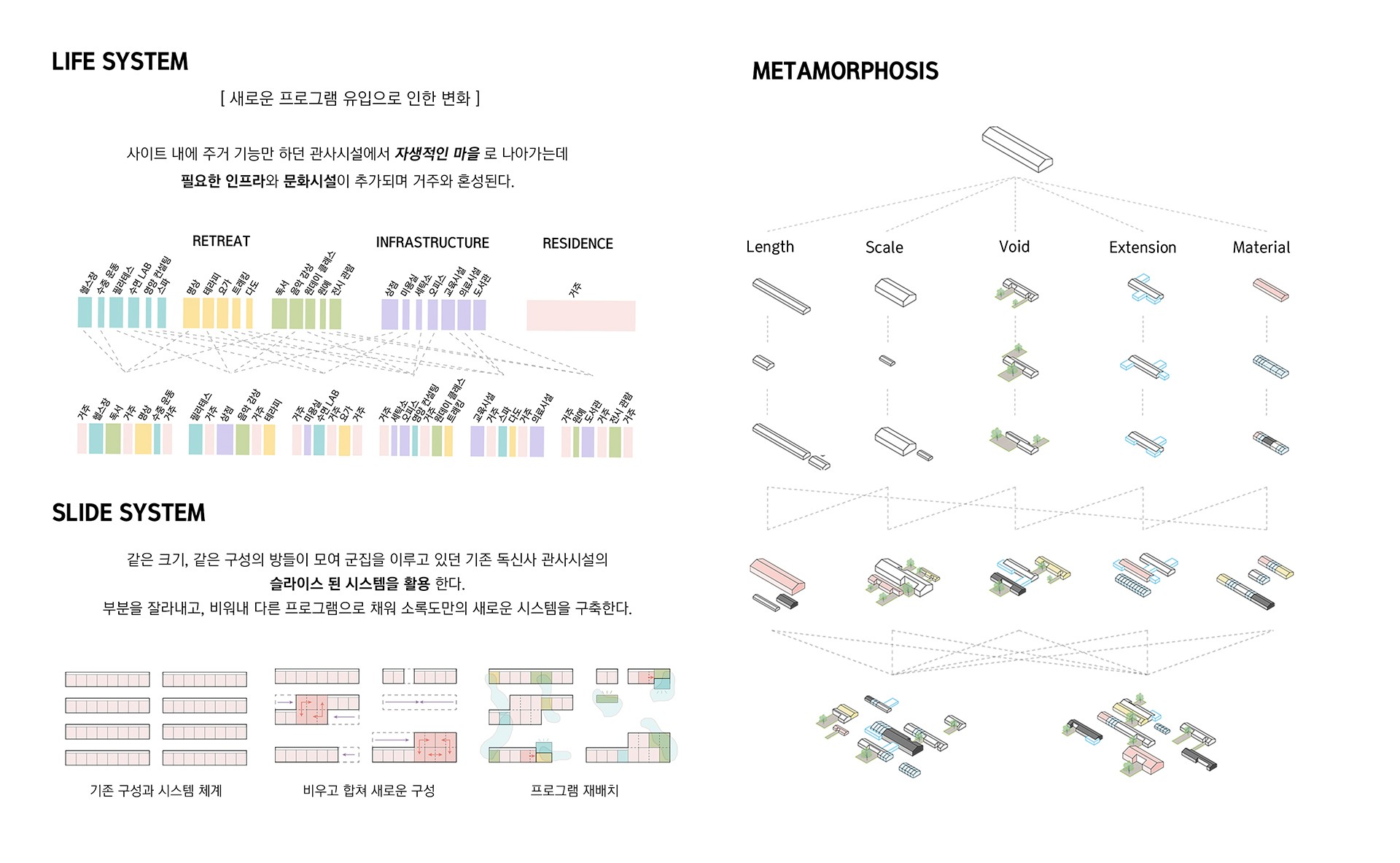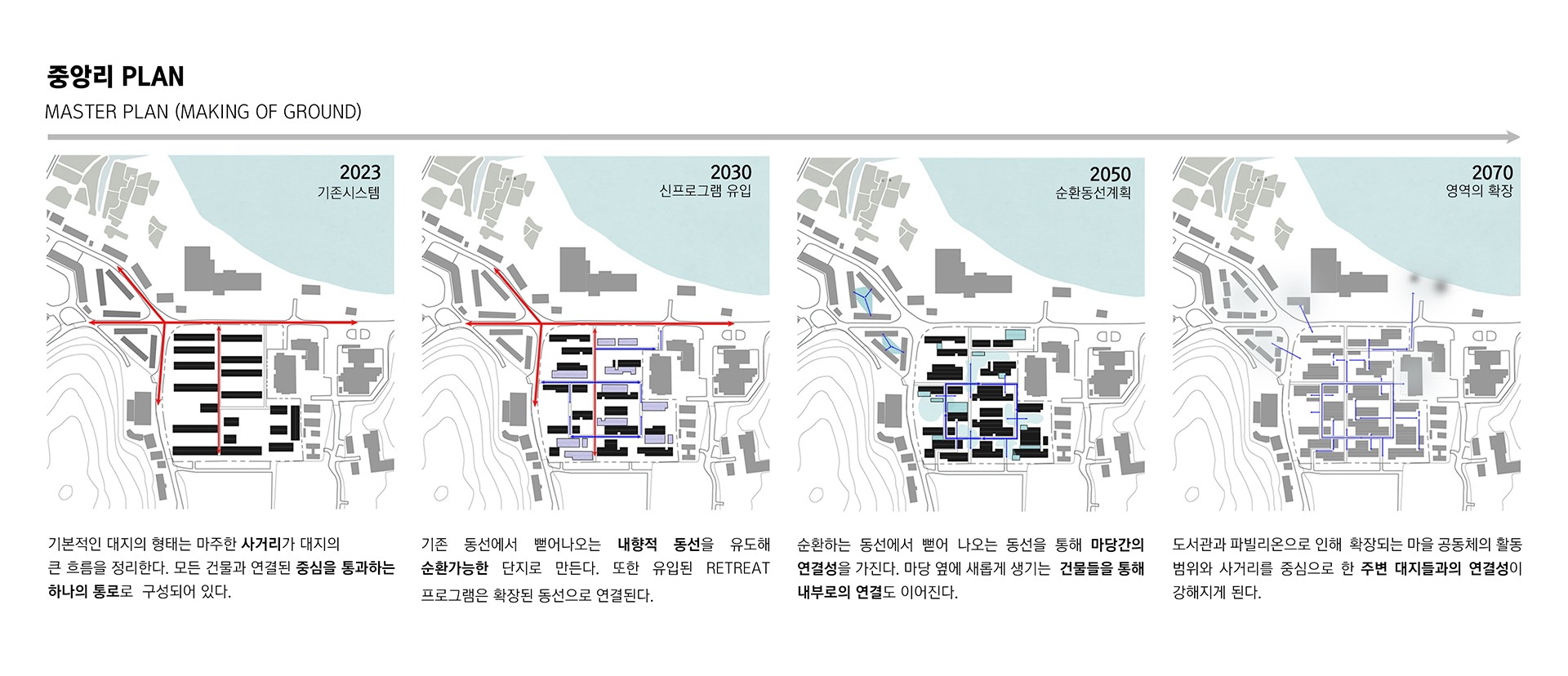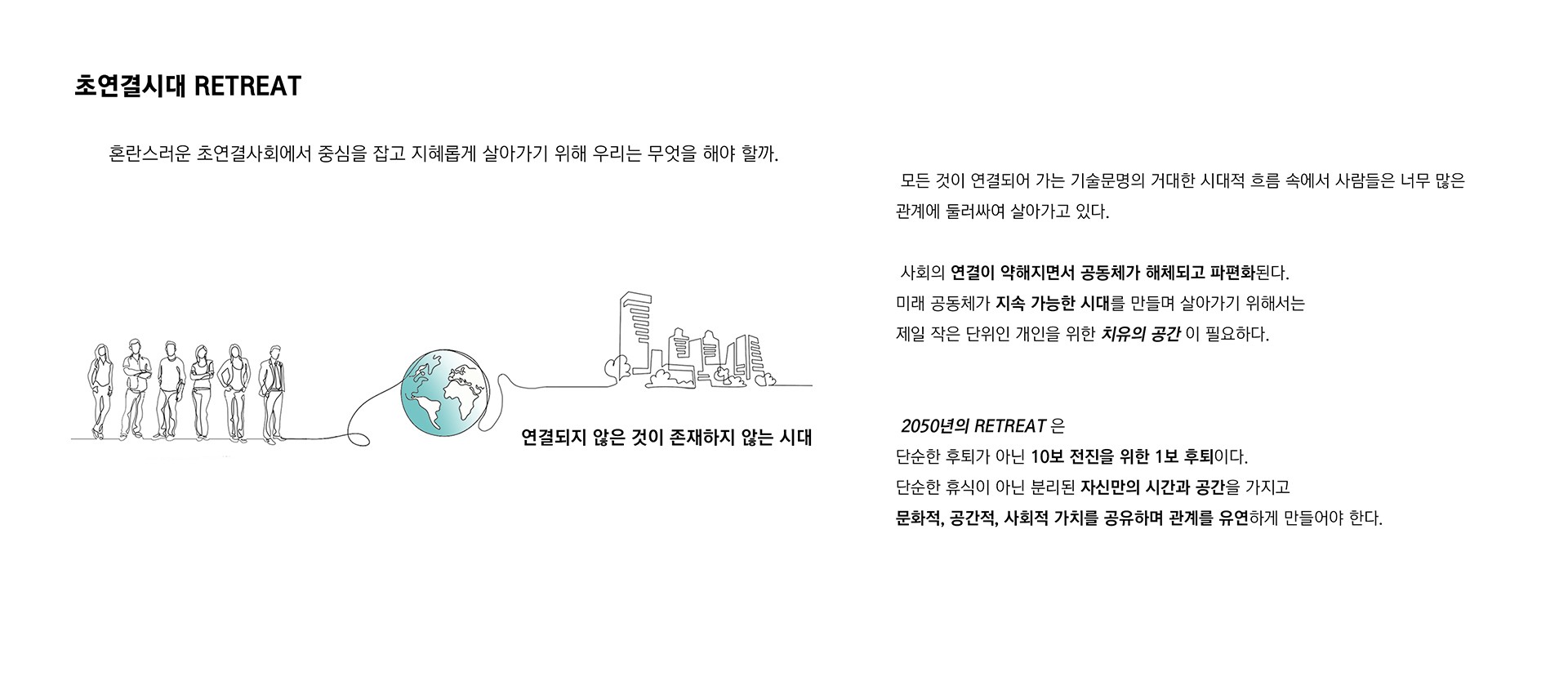 지금의 공동체 그리고 미래의 공동체가 지속 가능한 시대를 만들며 살아가기 위해서는 제일 작은 단위인 개인을 위한 치유하고 쉬어가는 공간이 필요하다. 2050년의 RETREAT은 단순한 후퇴나 휴양이 아닌 10보 전진을 위한 1보 후퇴이다. 단순한 휴식이 아닌 적당히 분리된 자신만의 시간과 공간을 가지고 문화적, 공간적, 사회적 가치를 공유하며 사람과 사람의 관계를 유연하게 만들어야 한다.