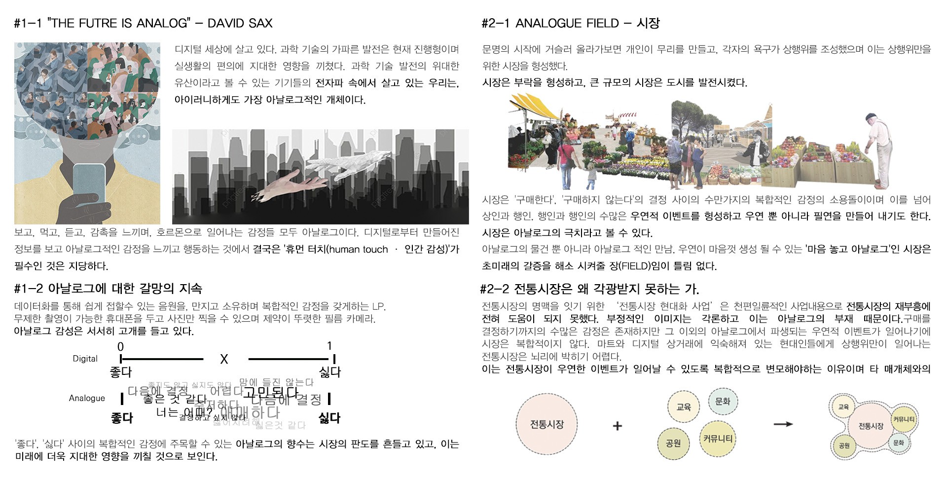 시장이 다시금 각광받기 위해서는 직접적인 물품을 거래하는 것뿐만 아니라, 전통과 문화, 인간과의 상호작용, 심지어는 그곳에서 느낄 수 있는 '오감'까지 함께 거래하는 것이 바로 그 대안이 된 것이다.