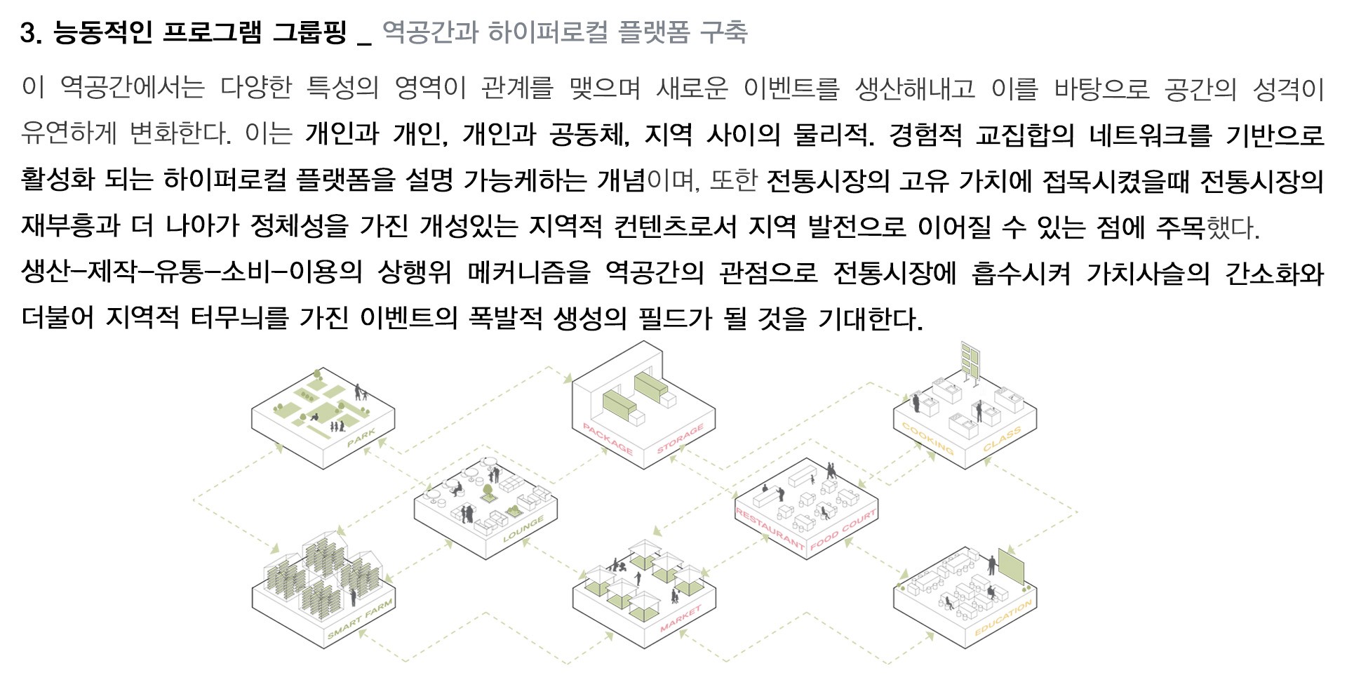이렇듯 시장은 입지적 유리함에 기초하여 상품을 매개체로 사람간 다양한 관계가 형성유지되는 장소로, 복합적 기능을 통해 사람들의 활발한 이용을 유발시키는 커뮤니티 장(FIELD)임에 틀림없다.