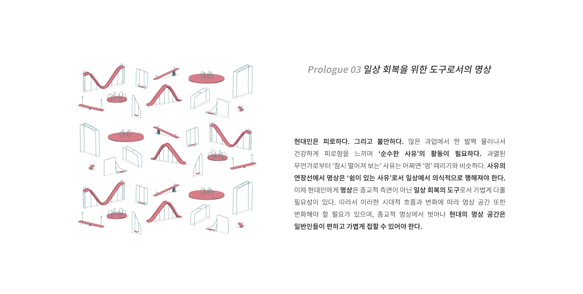 현대인은 피로하다. 그리고 불안하다. 많은 과업에서 한 발짝 물러나서 건강하게 피로함을 느끼며 ‘순수한 사유’의 활동이 필요하다. 과열된 무언가로부터 ‘잠시 떨어져 보는’ 사유는 어쩌면 ‘멍’ 때리기와 비슷하다. 사유의 연장선에서 명상은 ‘쉼이 있는 사유’로서 일상에서 의식적으로 행해져야 한다. 이제 현대인에게 명상은 종교적 측면이 아닌 일상 회복의 도구로서 가볍게 다룰 필요성이 있다. 따라서 이러한 시대적 흐름과 변화에 따라 명상 공간 또한 변화해야 할 필요가 있으며, 종교적 명상에서 벗어나 현대의 명상 공간은 일반인들이 편하고 가볍게 접할 수 있어야 한다.