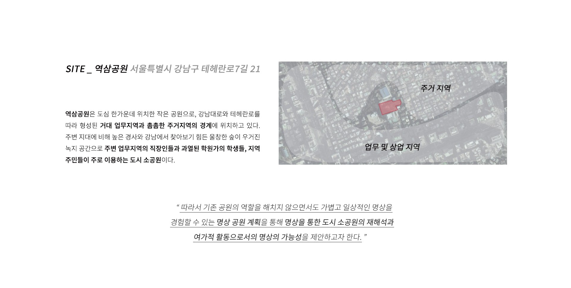 “ 따라서 기존 공원의 역할을 해치지 않으면서도 가볍고 일상적인 명상을 경험할 수 있는 명상 공원 계획을 통해 명상을 통한 도시 소공원의 재해석과 여가적 활동으로서의 명상의 가능성을 제안하고자 한다. ”