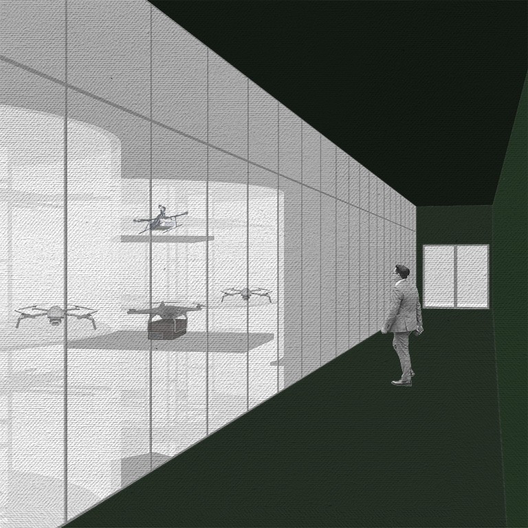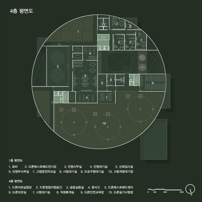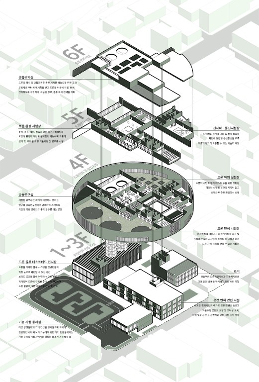 뿐만 아니라 드론은 용도에 따라 자동차에 비해 크기나 형태가 다양해 시험의 형태도 시시각각 바뀔 것이므로 이를 상시 관리할 수 있는 드론관련시설을 배치하여 한 건축물에 개발, 정비 등 분야간 즉각적인 상호작용을 할 수 있게 한다.