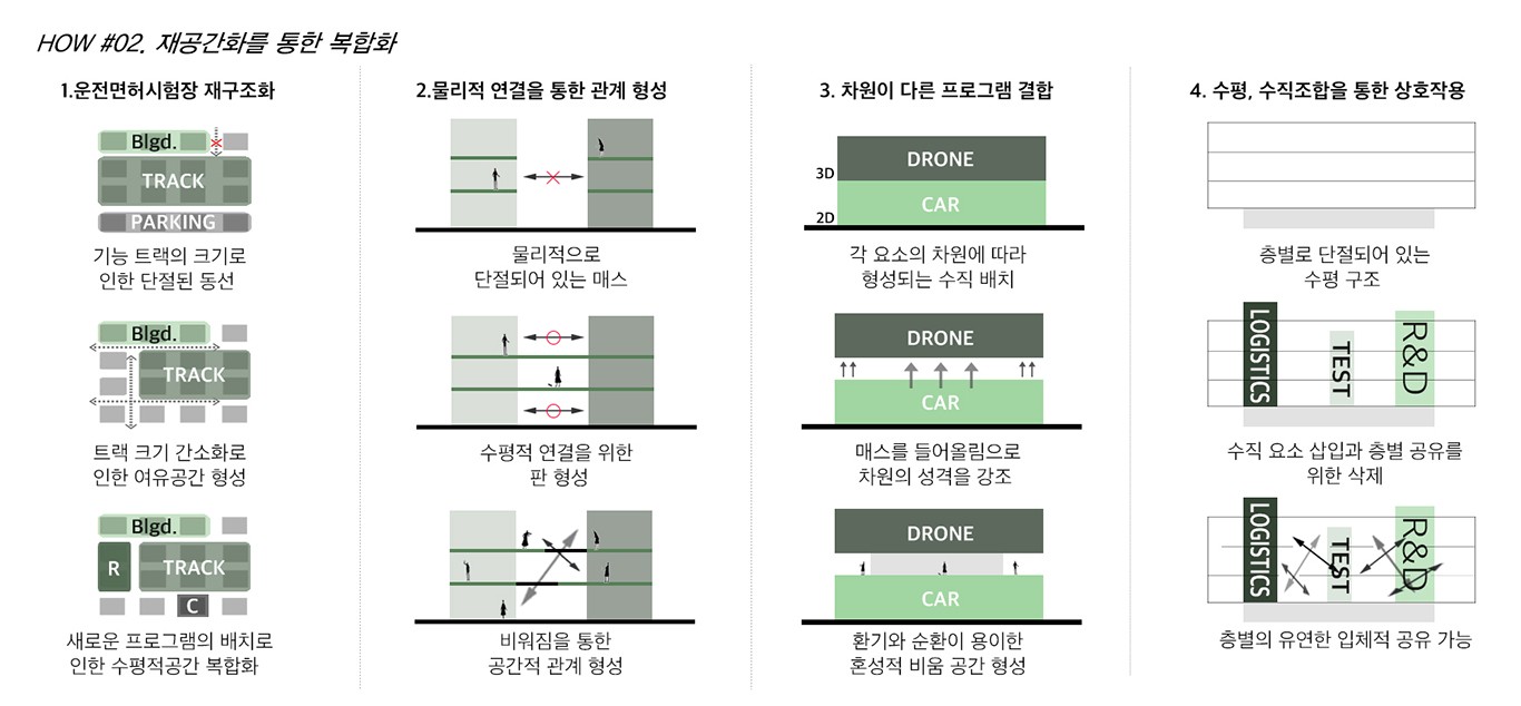 하지만 면허는 도덕적인 측면과 비상시 운용능력을 위해 사라지지는 않아 면허시험장은 지속적으로 존재할 것인데, 낭비되고 있는 넓은 면적을 도시가 필요로 하는 밀도가 있는 공간으로 구성하며 복합화한다면 고밀도로 변화하고 있는 도시공간과 어울리며 도시에 혜택을 줄 수 있는 공간으로 변화할 수 있을 것이다.