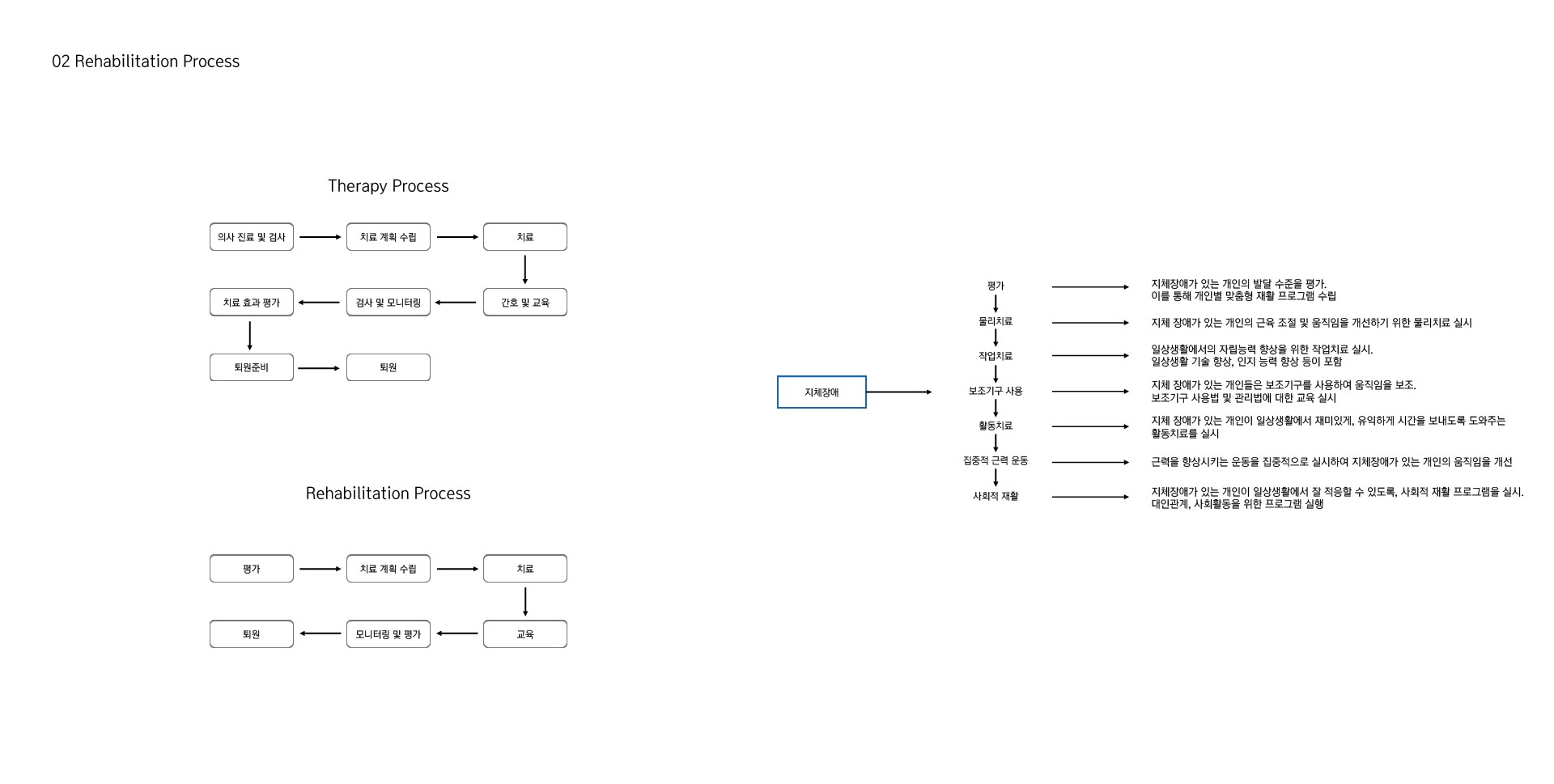 장애를 가진 개개인은 장애의 정도도 다르고, 재활 시스템을 수행할 수 있는 능력의 정도도 각자 다르다.