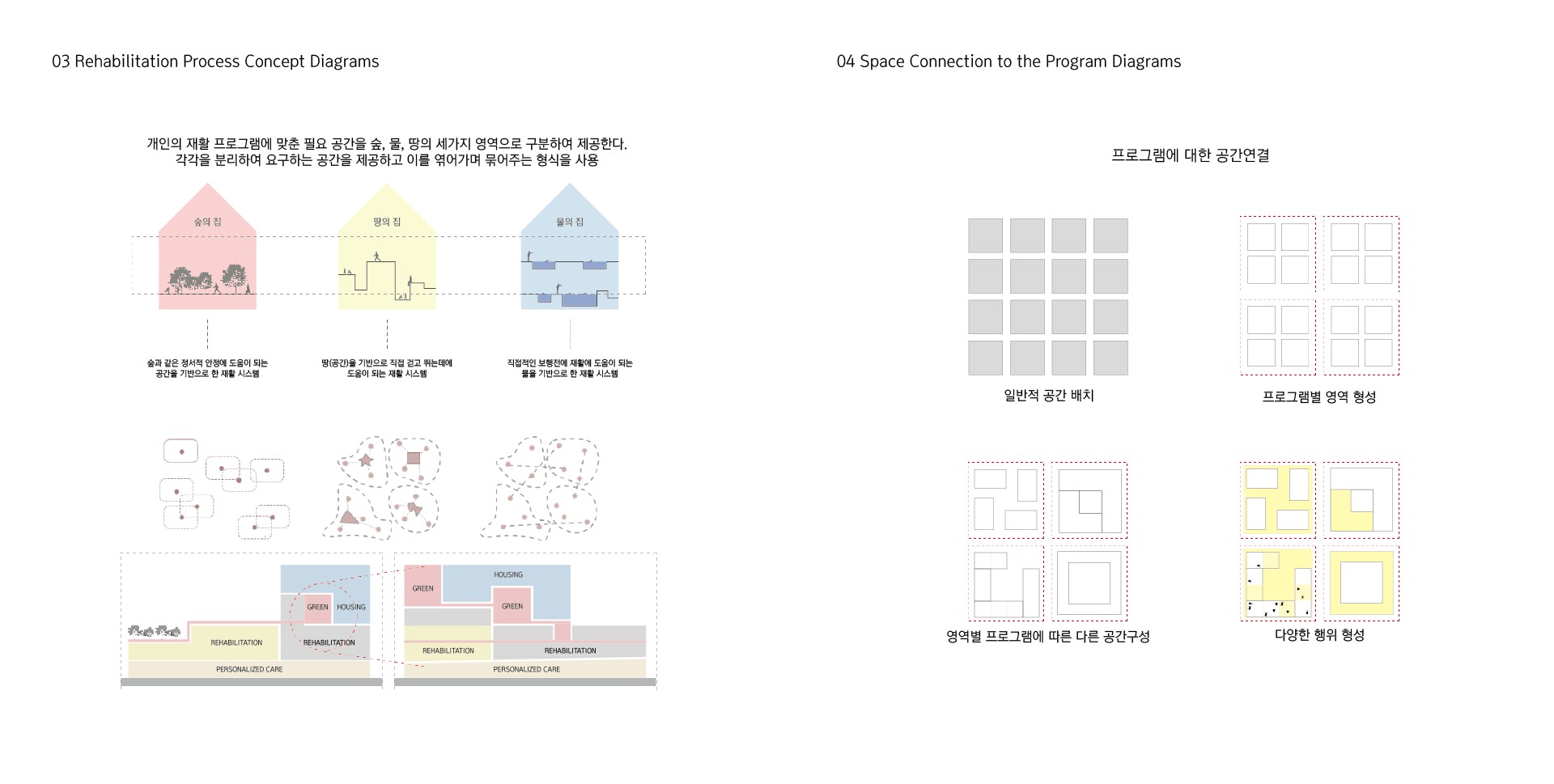 일반적인 재활 시설의 경우 대부분 치료시설과 재활시설을 동시에 제공하며, 이를 따로 구분짓지 않는다. 이는 건물 내 동선 겹침 현상이 발생하며, 치료와 재활의 두 분야가 제 기능을 모두 발휘하기 힘들다.