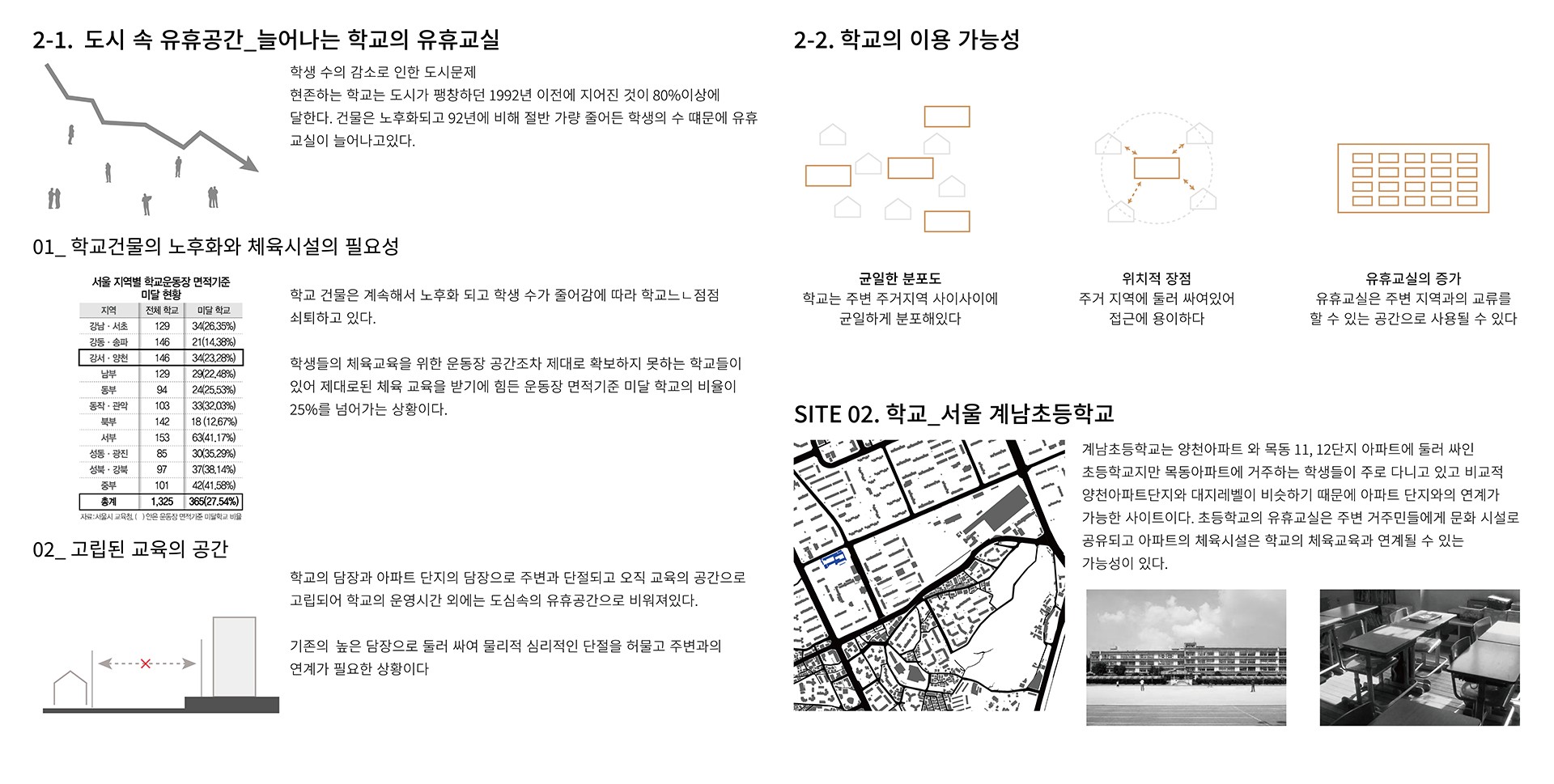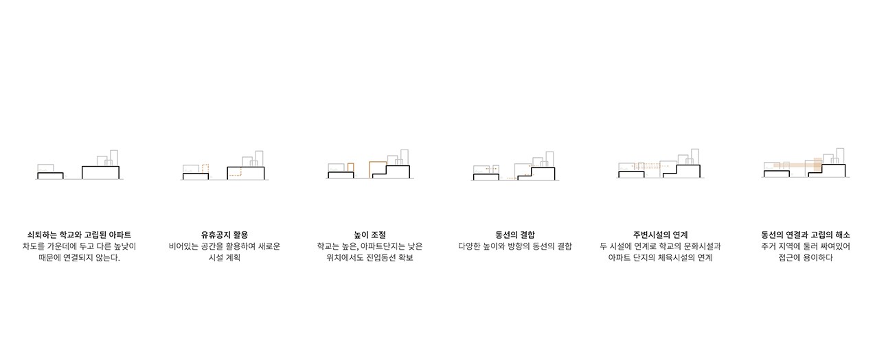고립과 수직, 수평으로 생기는 보행자 동선의 단절을 해결해야한다. 이에 따라 주변과의 연결을 통해 고립을 해소하고, 끊어진 지역간의 교류를 통해