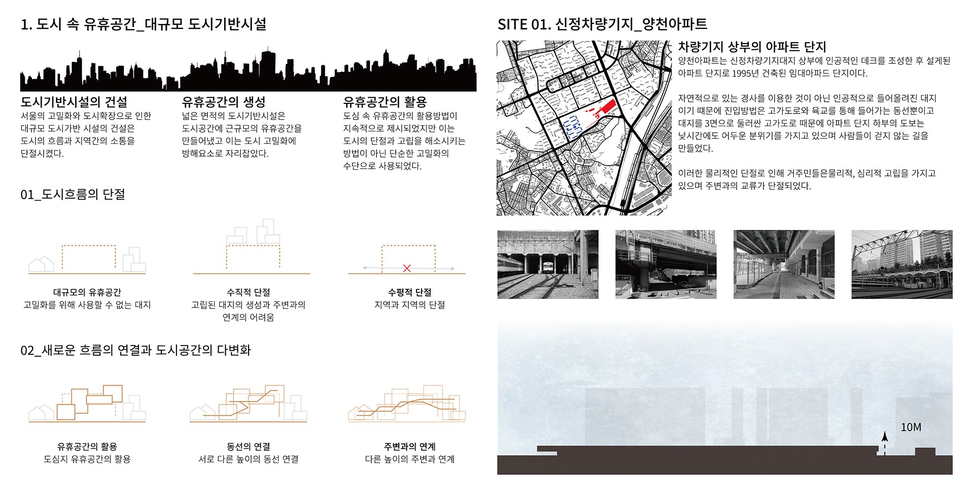 도시기반시설로 만들어진 유휴공간은 고밀화의 방해요소이며 지역과 지역간의 소통을 단절시키고 있다. 이를 해소하기 위한 방법은 해당지역의