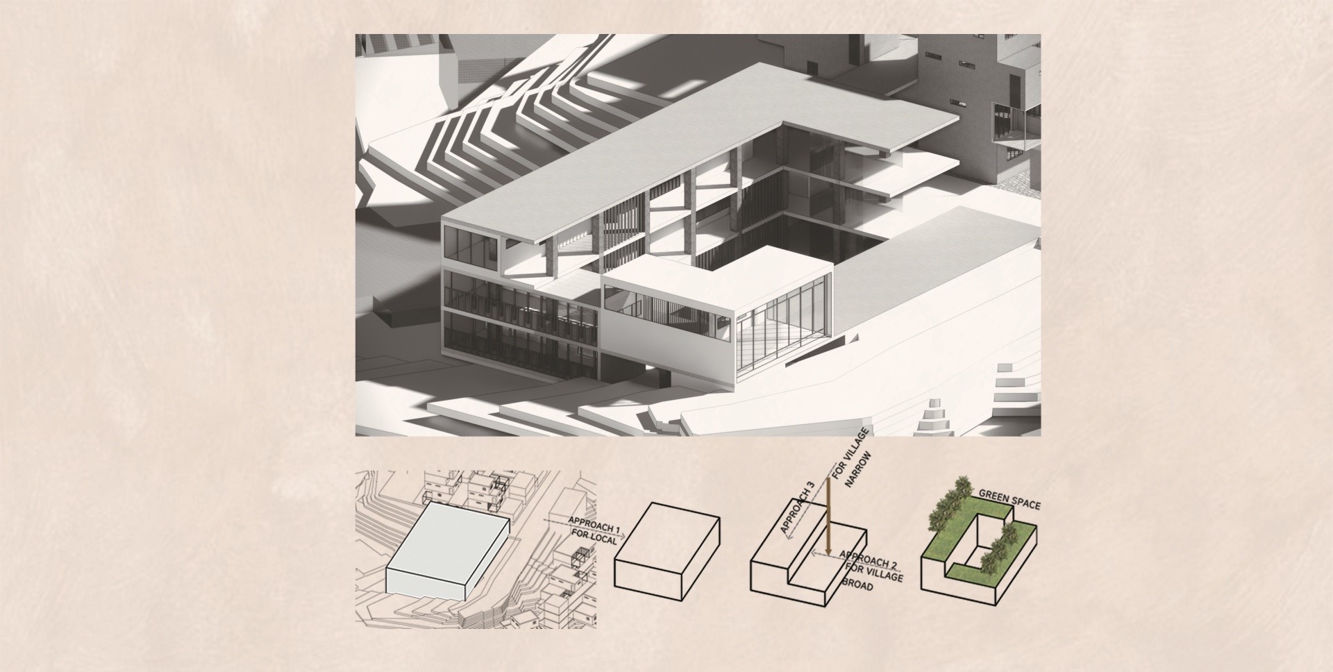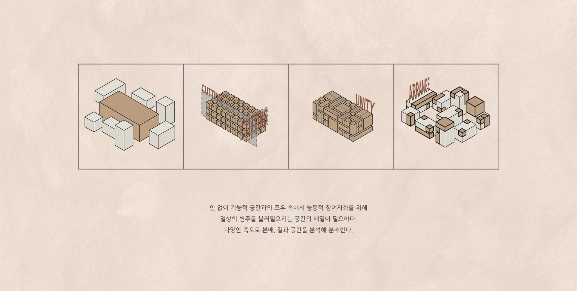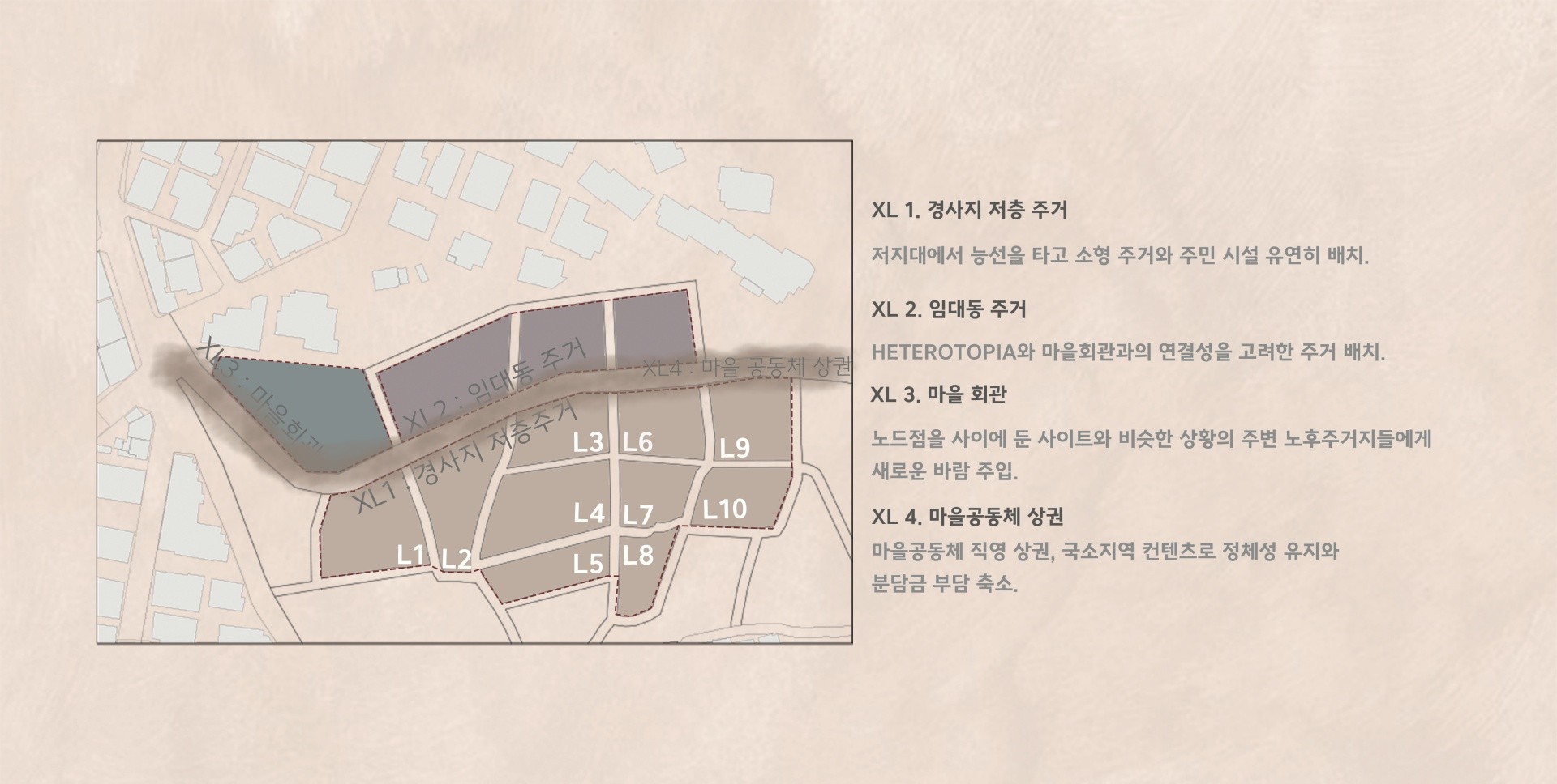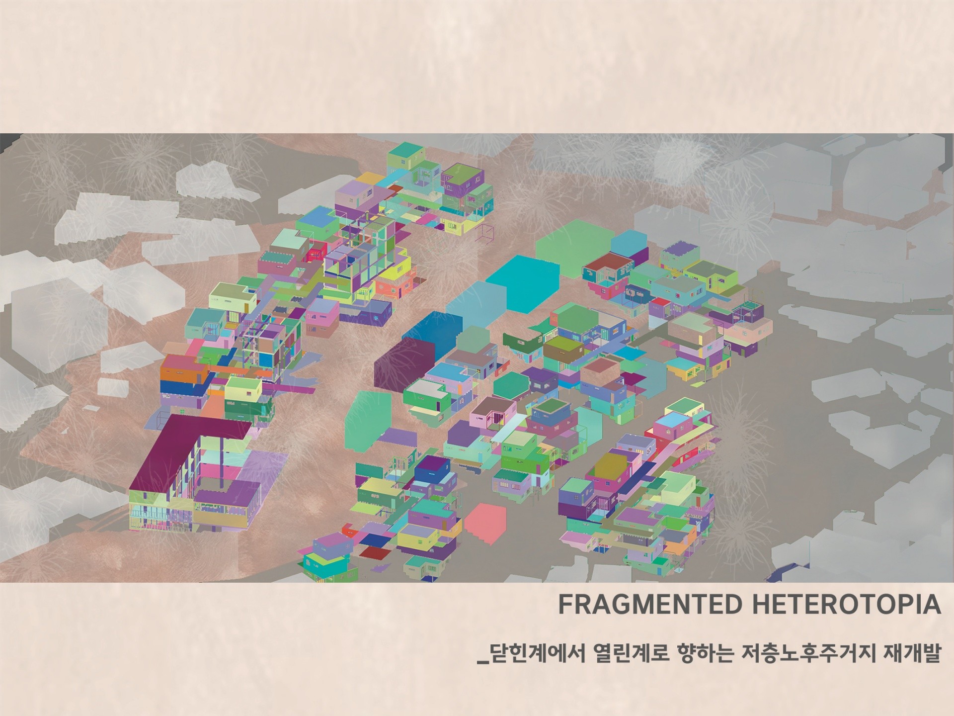 한결같이 닫혀 있는 공간에서 일어나는 일상 속에서의 요동상태를 위해 사이즈를 나눠 헤테로토피아를 분배시키는 것을 제안한다. 소방과 관련된 접근과 주민들이 매번 집으로 향하는 접근성을 향상시키기 위해 도로를 정비하며, 해당 도로와 공간들의 성격을 분석해 구역을 나눠 경사지에 위치한 저층주거/임대동 주거/ 마을공동체 상권/ 노드점을 이용한 마을 회관을 설계했다.