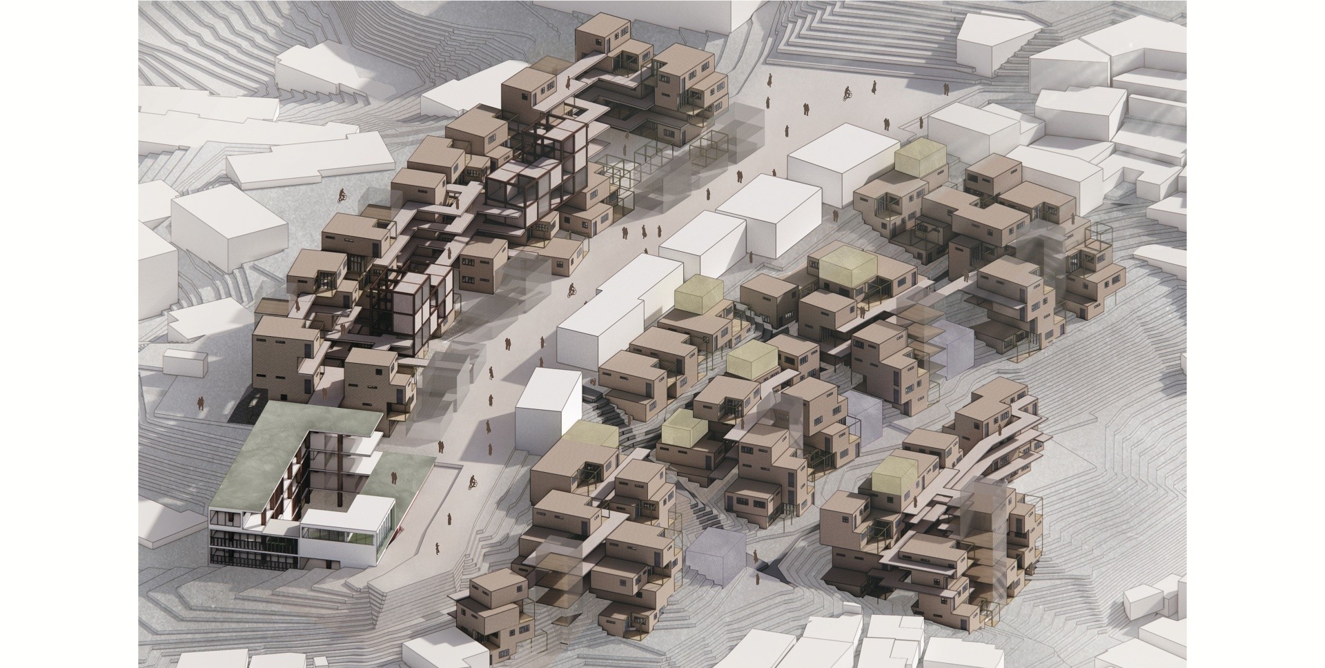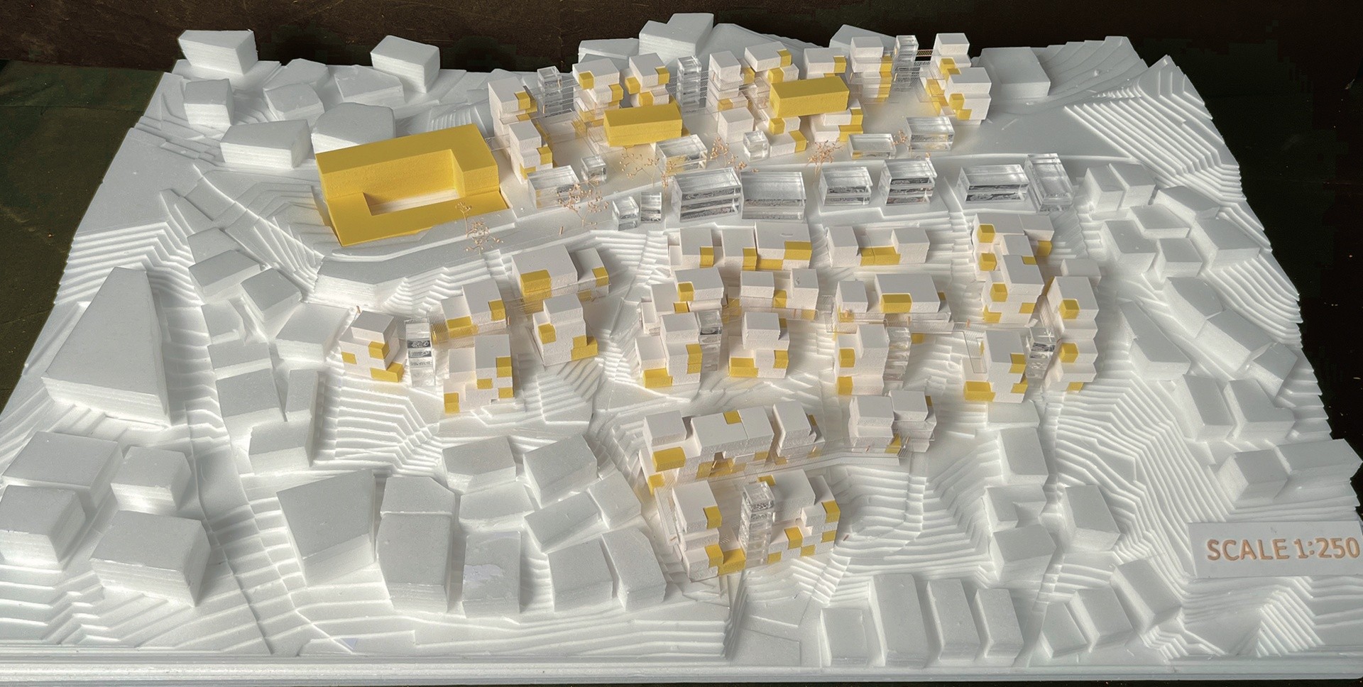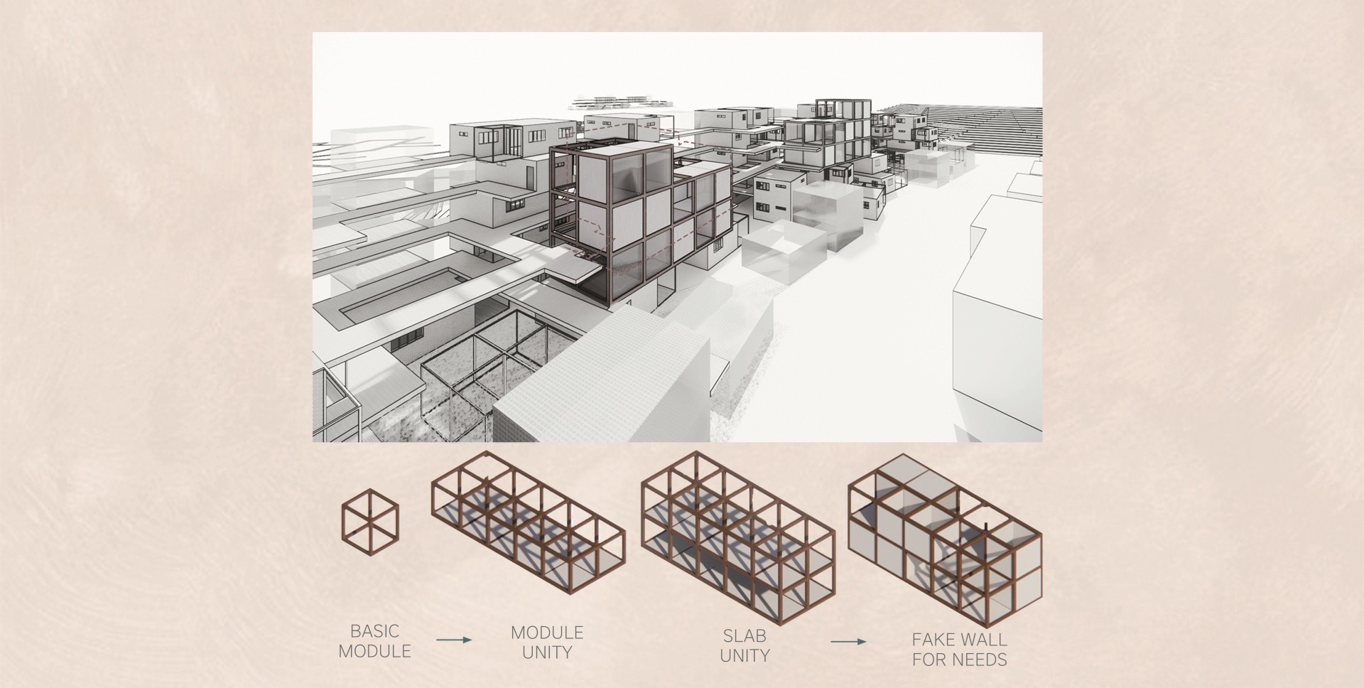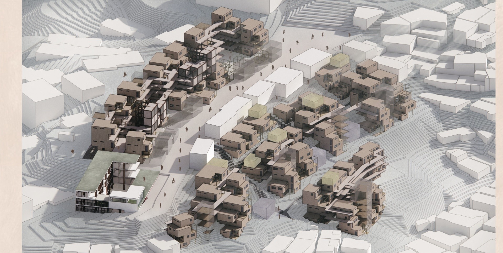 한결같이 닫혀 있는 공간에서 일어나는 일상 속에서의 요동상태를 위해 사이즈를 나눠 헤테로토피아를 분배시키는 것을 제안한다. 소방과 관련된 접근과 주민들이 매번 집으로 향하는 접근성을 향상시키기 위해 도로를 정비하며, 해당 도로와 공간들의 성격을 분석해 구역을 나눠 경사지에 위치한 저층주거/임대동 주거/ 마을공동체 상권/ 노드점을 이용한 마을 회관을 설계했다.
