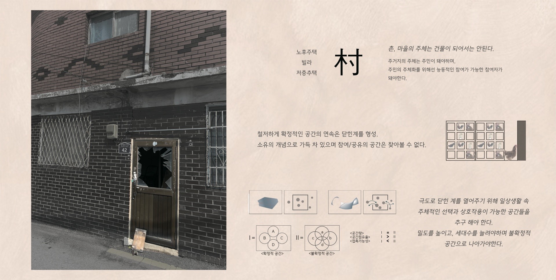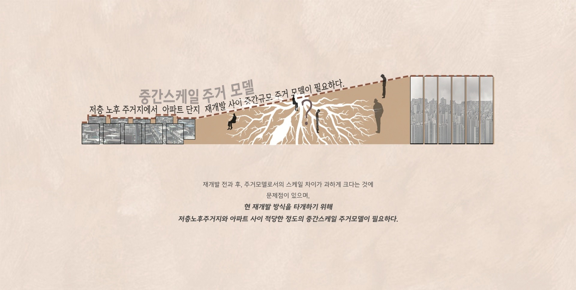 노후저층주거촌은 서울 곳곳에 산재해 있으며 이 곳의 문제점은 주민이 주체가 될 수 없다는 점과, 해당 지역에 주민들의 참여를 이끌어 낼 수 있는 여백이 부족하단 점에 있다. 철저하게 닫혀있는 확정적 공간들의 연속이며 꾸준히 공간에 대한 욕망과 수요가 증가하고 있는 추세에서 올바른 공간배열이 아니다. 일상적인 공간에 좀 더 반향을 일으킬 수 있는 공간을 제시하고, 그 공간들을 주민들이 자체적으로 선택하고 공유 할 수 있는 인프라의 확충은 그들의 삶의 질 향상으로 이어지고 아파트가 아닌 매력적인 주거모델이 될 수 있다.