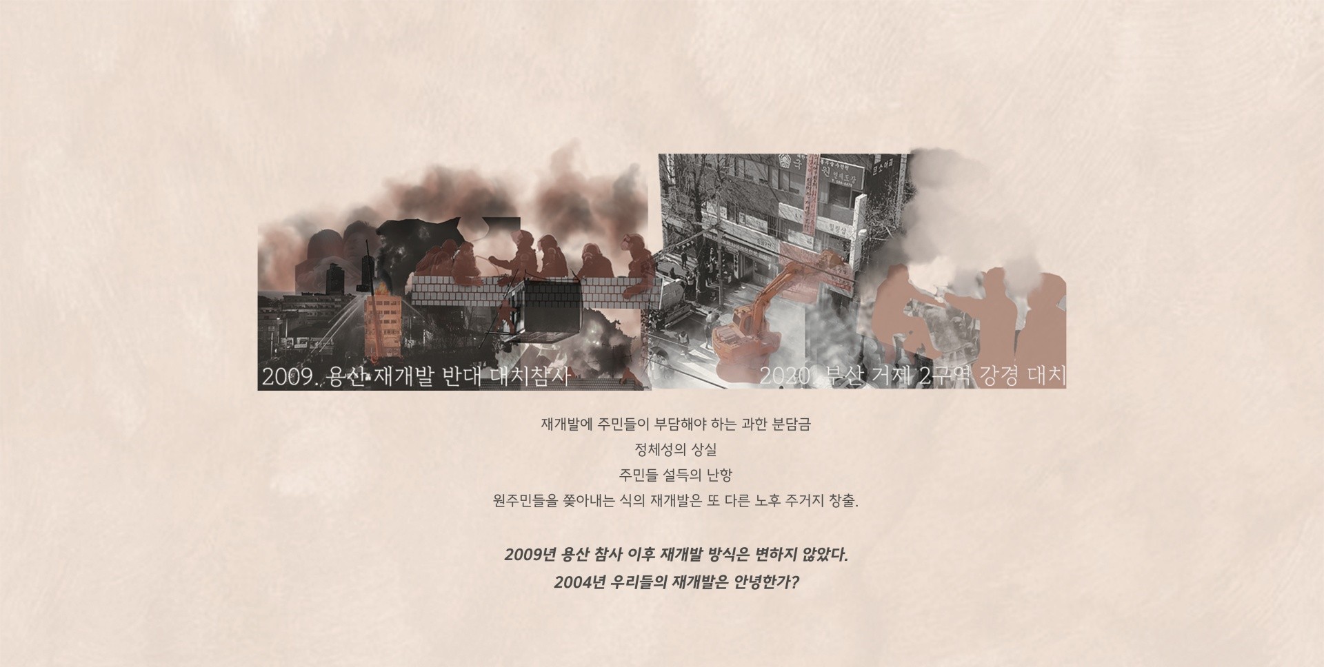 2009년 용산 참사 이후로도 원주민과의 무력 대치는 빈번히 일어나고 있으며 이는 우리들의 재개발 정책이 안녕하지 못하다는 방증이기도 하다. 세대 수로 따졌을 때 아파트 이외의 거주세대 수는 아파트의 그것과 비견됨을 알 수 있다. 이는 무조건적인 아파트 개발보다는 타 주거모델 주거지의 공실률을 줄이고 삶의 질을 향상시키는 것에 초점을 맞춰야한다는 증거이다.