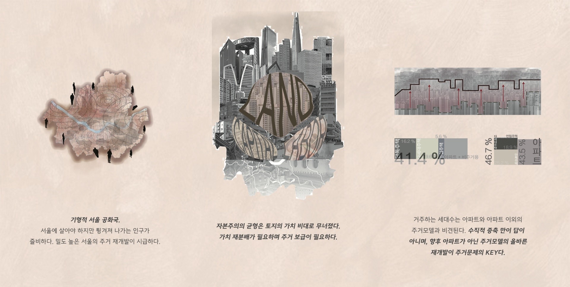 대한민국의 자본주의 구조는 불균형으로 치달았다. 토지 및 주거의 가치비대가 심화 되고 있으며 초고밀도의 서울에서 튕겨나가 인프라를 제공받지 못하는 사람들이 증가하는 추세이다. 가치 재분배를 위한 적정가격의 주택보급이 심각하며 이는 사회 전반의 여러 문제들의 해결책이기도 하다.