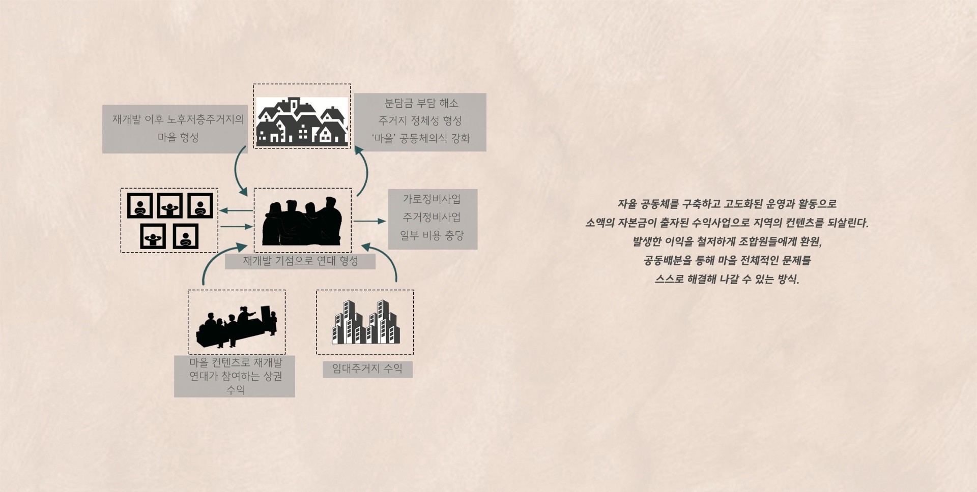 다양한 공유공간이 나타나고 해당 지역 컨텐츠를 이용한 마을자치공동체 단위의 상업시설을 설정해 오래동안 터전을 지켜오던 원주민들이 정체성을 유지 할 수 있으며 임대동과 상업시설 수익금이 다시 마을자치조합에게 환원돼 자체적으로 마을을 발전 시킬 수 있는 메커니즘을 제안한다.
