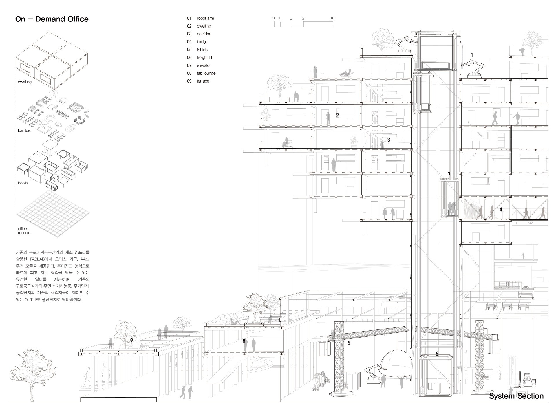 사이트인 구로기계공구상가는 프로그램을 담을 수 있는 블럭으로 이루어져 있지만 폐쇄적인 구조로 인해 지속가능성이 불투명하다.