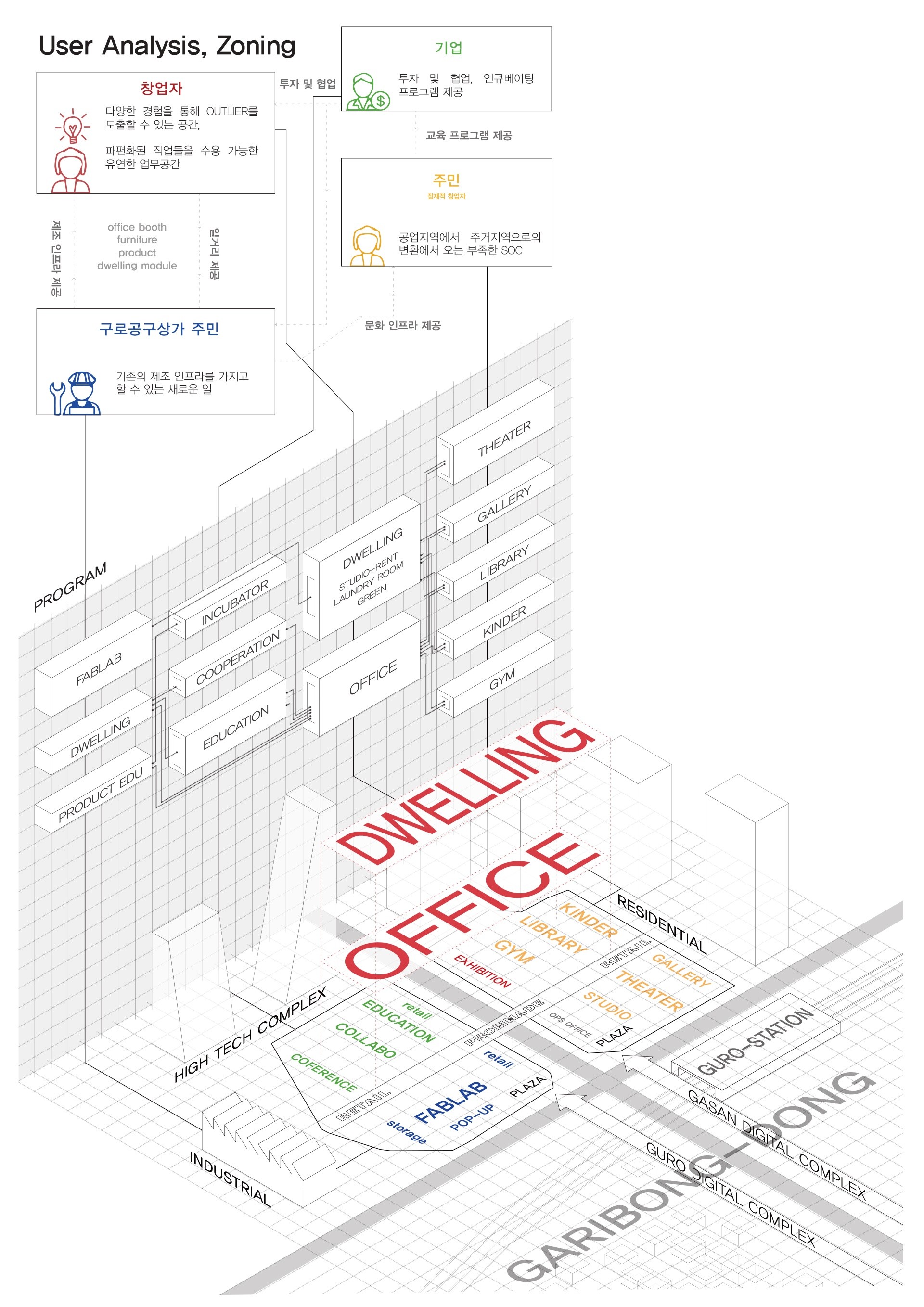 도시 스케일부터 사이트 스케일까지 대지분석을 통해 네 종류의 사용자를 특정해내고, 이들을 만족시키는 프로그램을 제공하여,