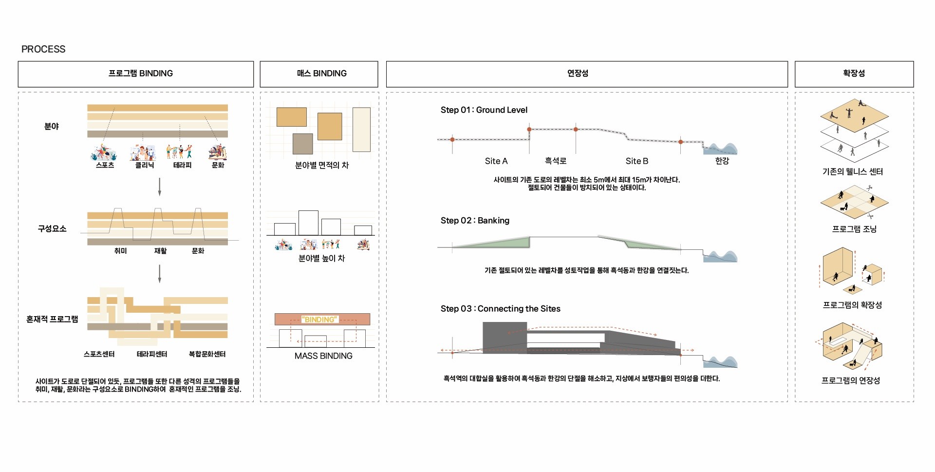 이 설계는 웰니스 센터, 청년 커뮤니티 센터, 복합 문화시설을 중심으로 통합된 공간 구성을 하고 있다. 한강과 직접 연결되는 공공성을 강조하며, 방문객들이 다양한 목적과 필요에 맞게 유연하게 이용할 수 있는 공간을 제공한다.