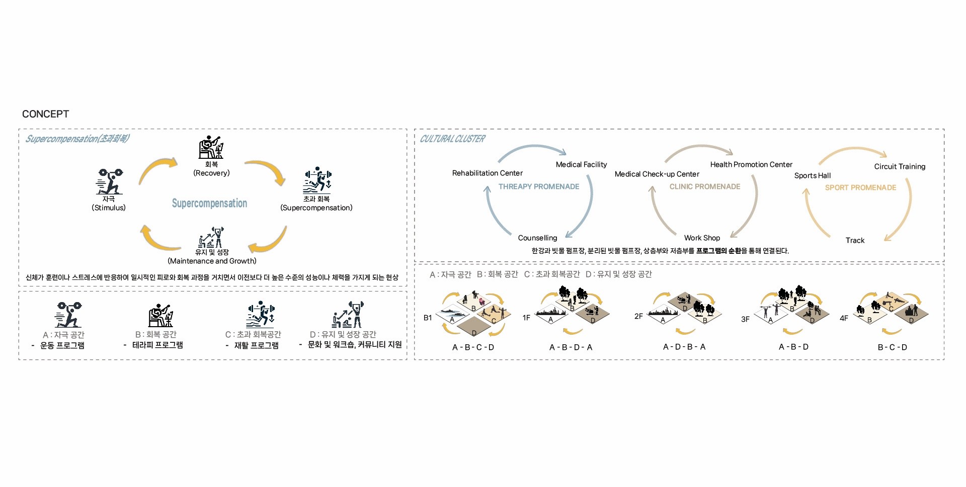 또한 초과회복(Supercompensation) 개념을 바탕으로 시퀀스를 구성했다. 운동 및 재활 운동 후 테라피 치료를 통해 신체적 휴식을 취하고, 식사를 통해 영양을 보충하며, 강의실, 교육실, 상담실 등을 통해 추가적인 정보를 얻을 수 있도록 설계했다. 그 외에도 다양한 목적과 필요에 맞는 프로그램들을 마련해 방문객들이 자신에게 맞는 경험을 통해 건강과 삶의 질을 향상시킬 수 있게 했다. 신체적 회복뿐만 아니라 정신적, 정보적 충전을 함께 제공하는 유연하고 통합적인 치유 공간을 목표로 한다.