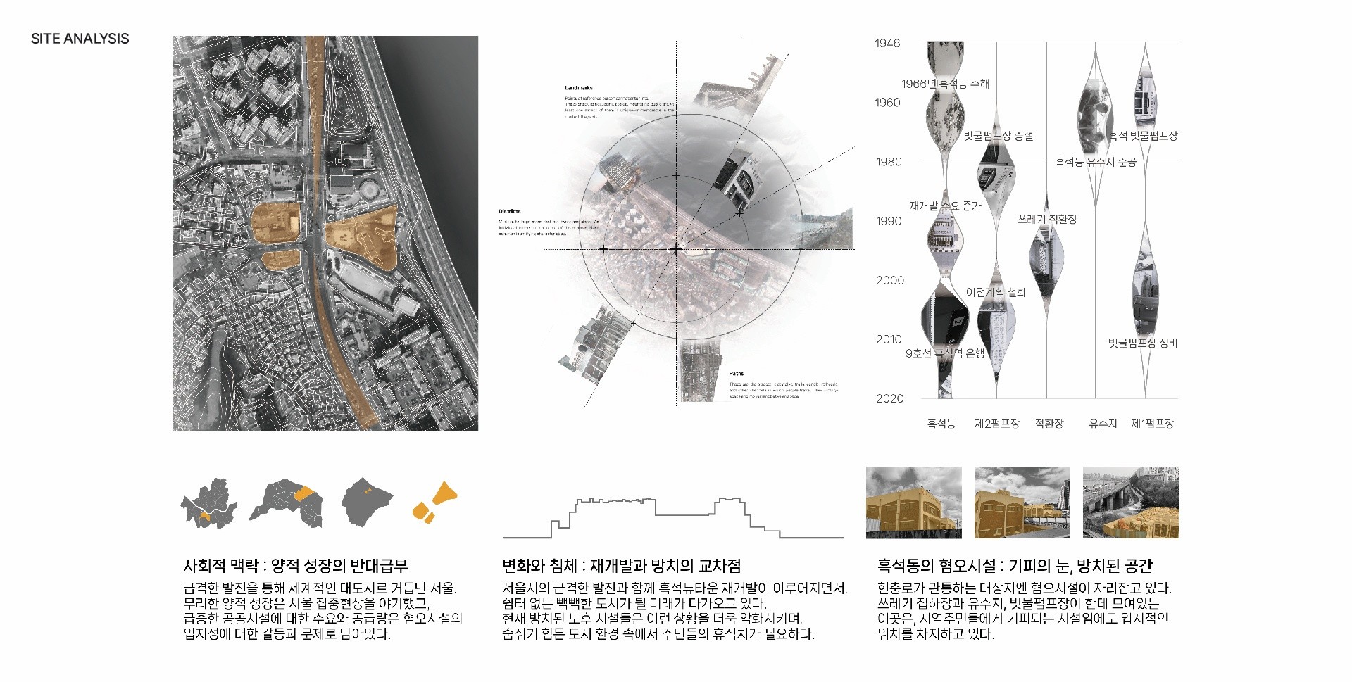 흑석역 주변 사이트는 방치된 빗물펌프장과 쓰레기 매립장이 있는 혐오시설로, 한강과 가깝지만 접근성이 부족하고 파편화된 건물들로 인해 휴식 공간이 부족한 상황이다. 이 문제를 해결하고 세대 간의 단절을 해소하기 위해 다양한 프로그램을 기획하게 되었다.