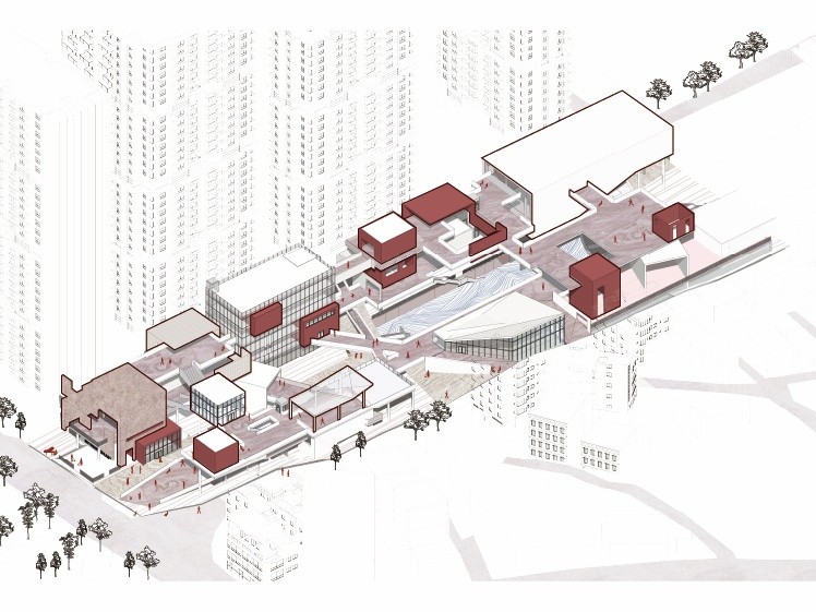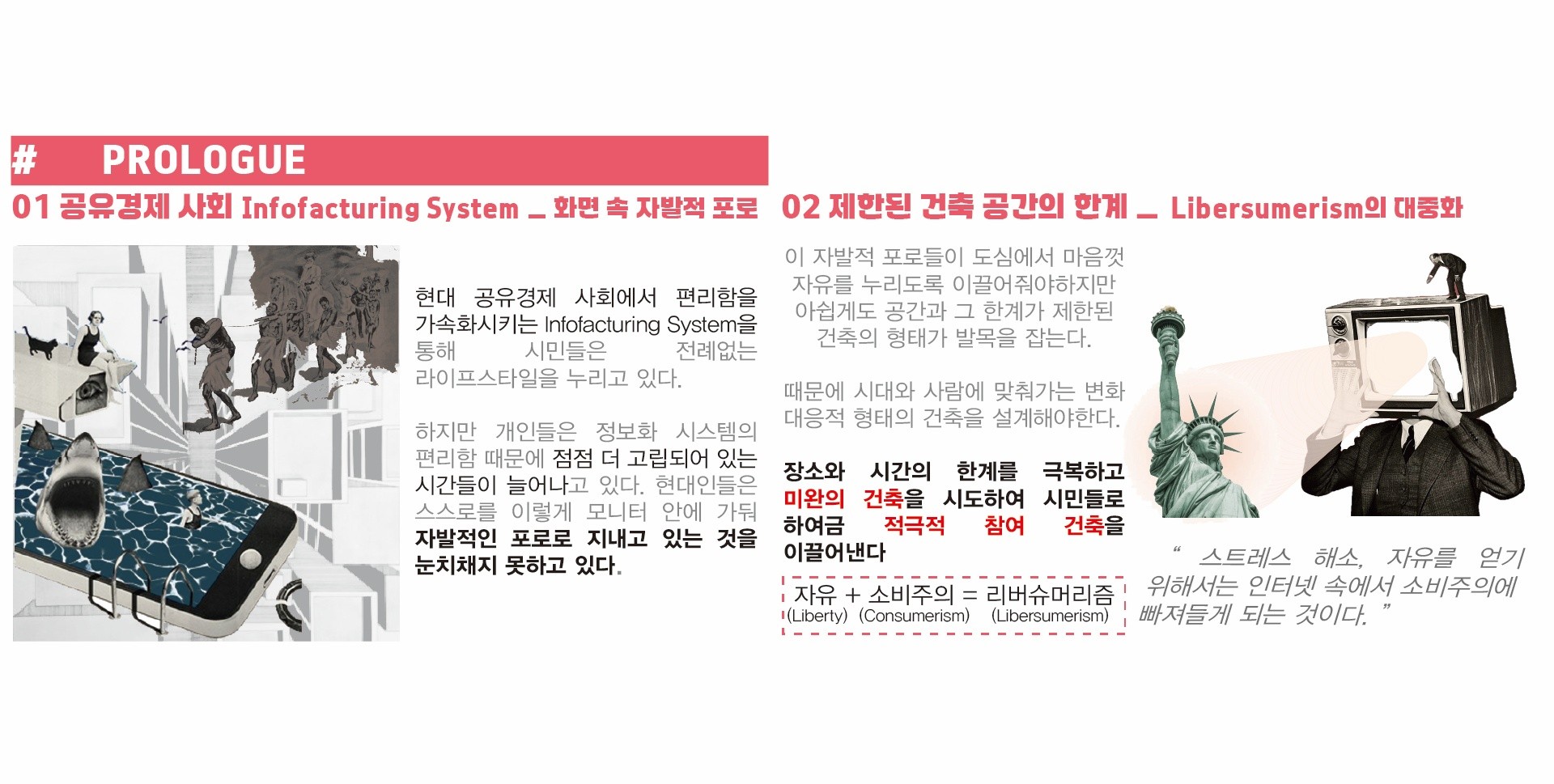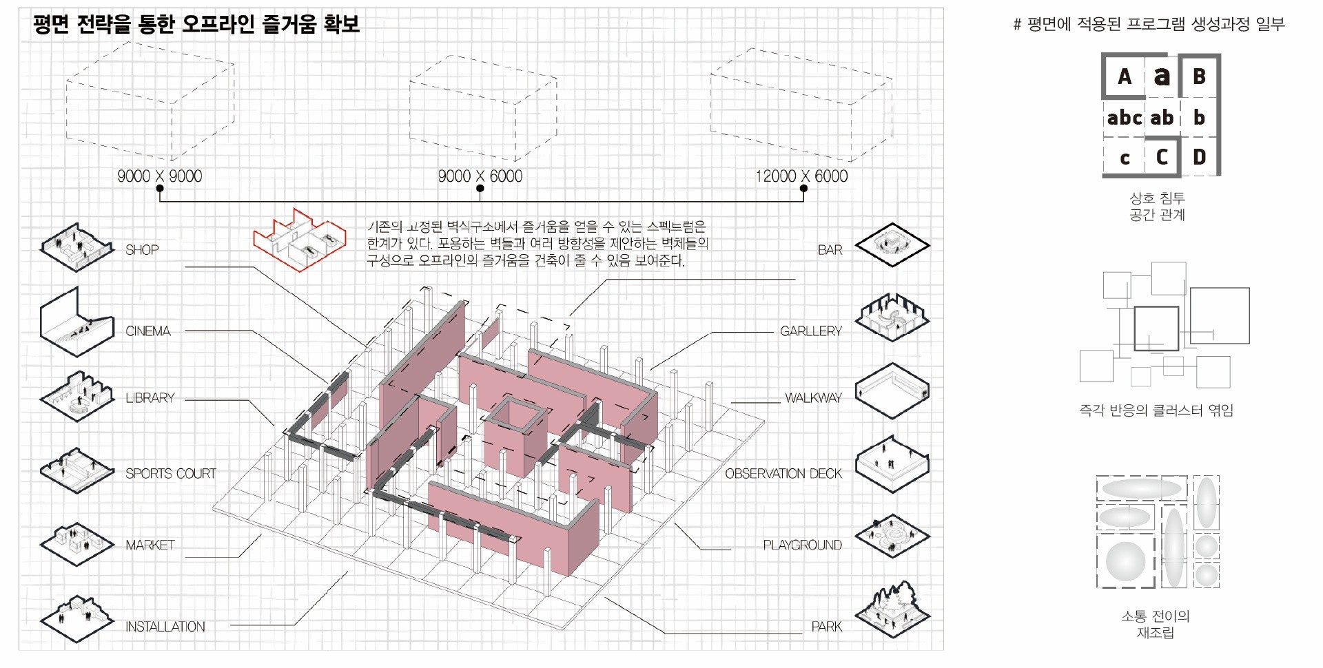 일정 배율로 정비된 공간 안에 상호 침투적 공간 관계성을 형성하여 가변적으로 참여 범위를 늘린다. 또한 그러한 집합체의 클러스터들이 즉각 반응할 수 있는 형태로서 열린 형태를 제안한다.