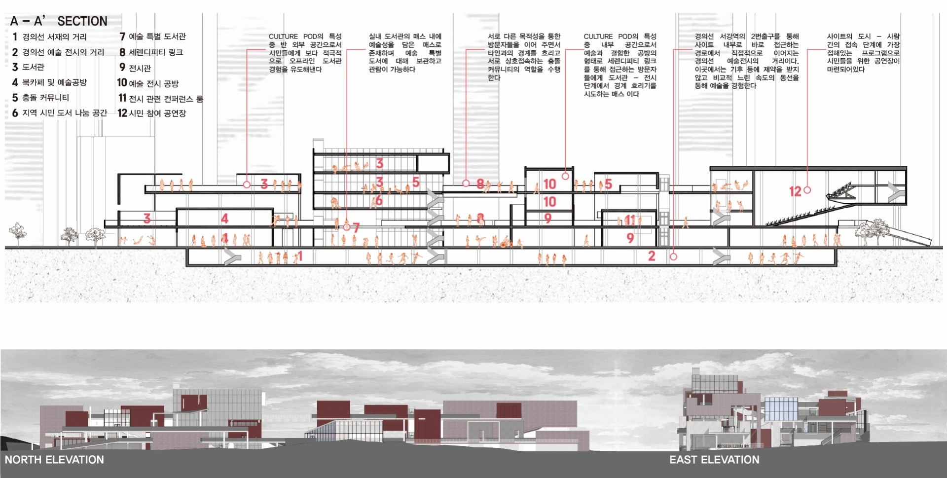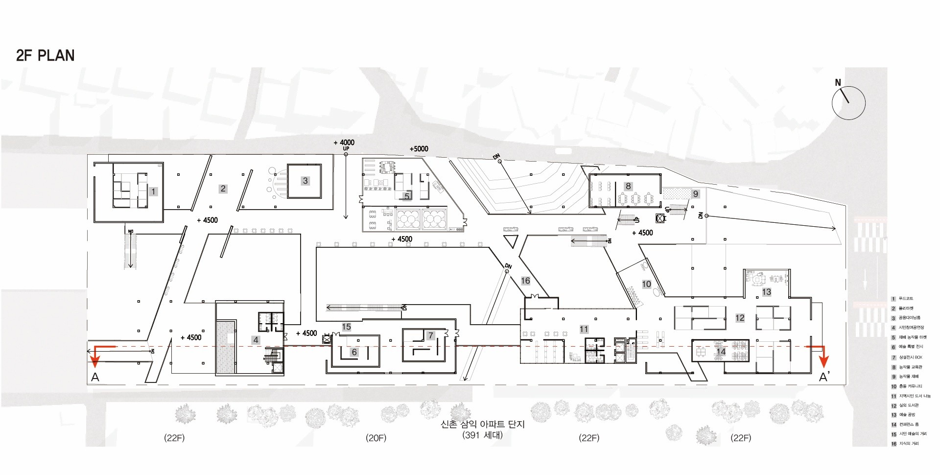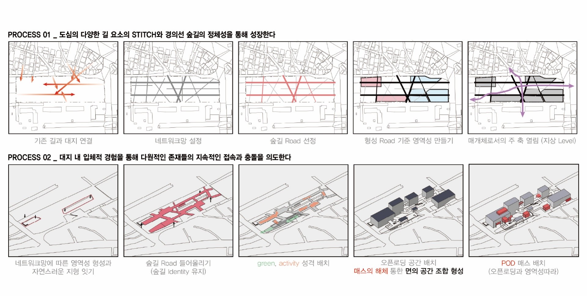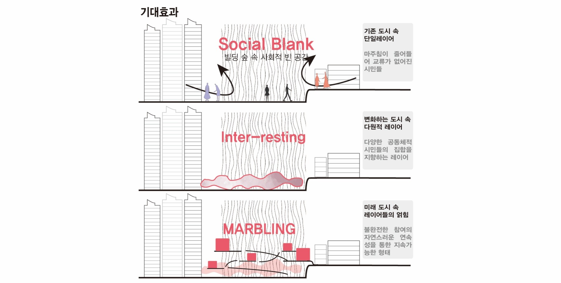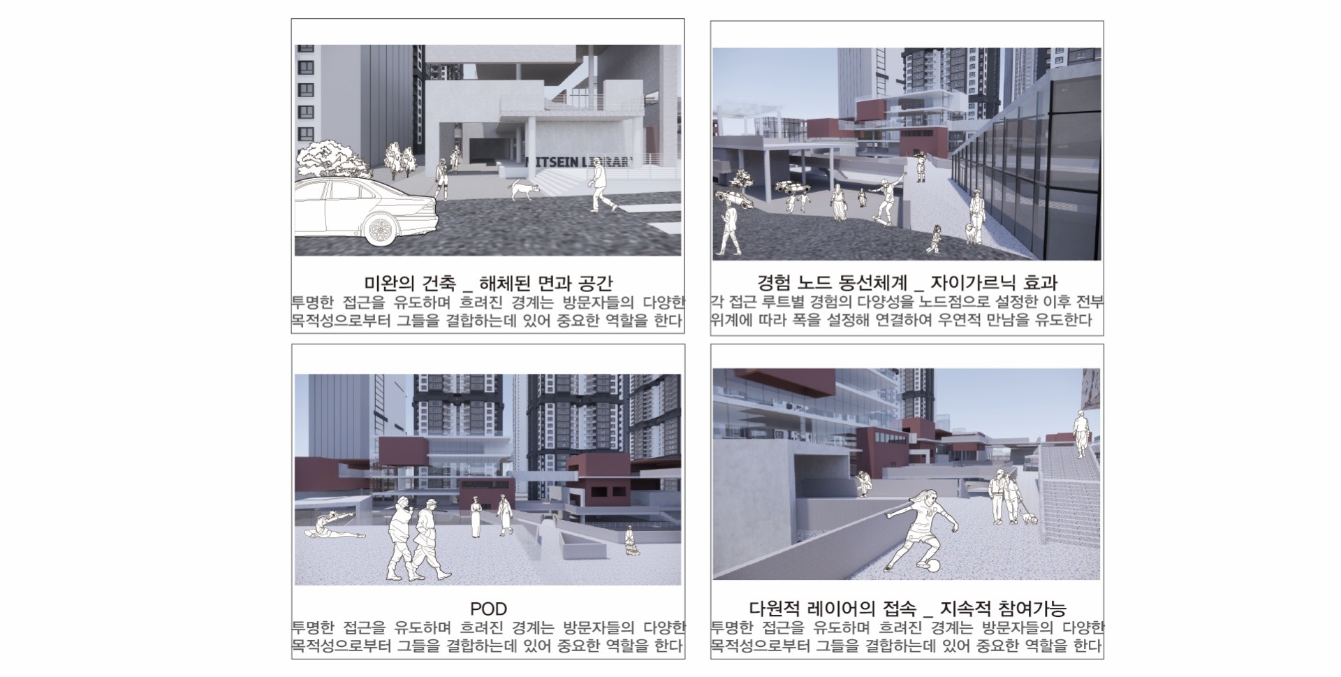 이러한 동선체계의 재정비를 통해 마주침의 경우의 수를 높이고 의도된 공간들에서의 접속가능성을 증가시킨다.