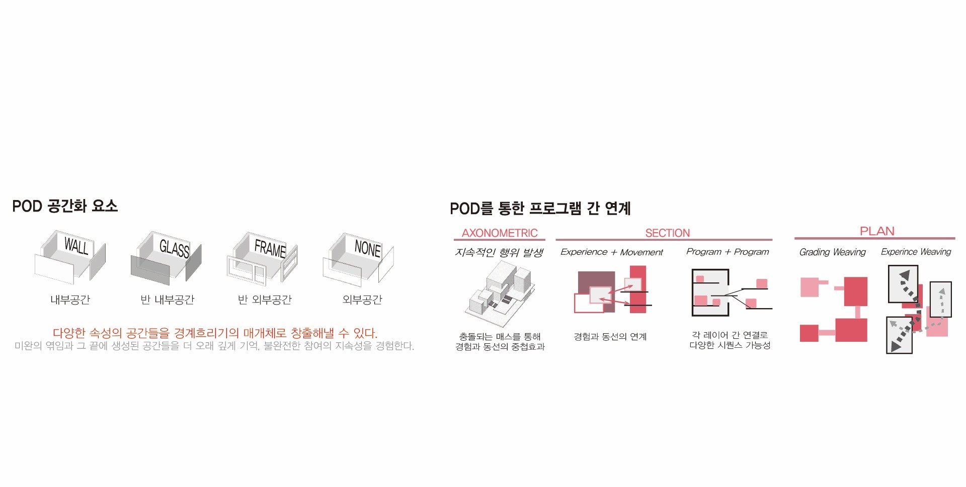 열매를 의미하는 POD라는 개념을 시스템과 공간에 도입해보고자한다. 뿌리부터 엮이는 지속가능성을 지닌채 다양한 동선체계에서 스며 들어와 줄기를 타고 올라 각각 POD 공간들을 체험하고 건축적인 놀이터를 경험하며 시민들의 화합과 융합을 꾀한다면 우리는 원초적인 즐거움을 찾을 수 있을것이다.