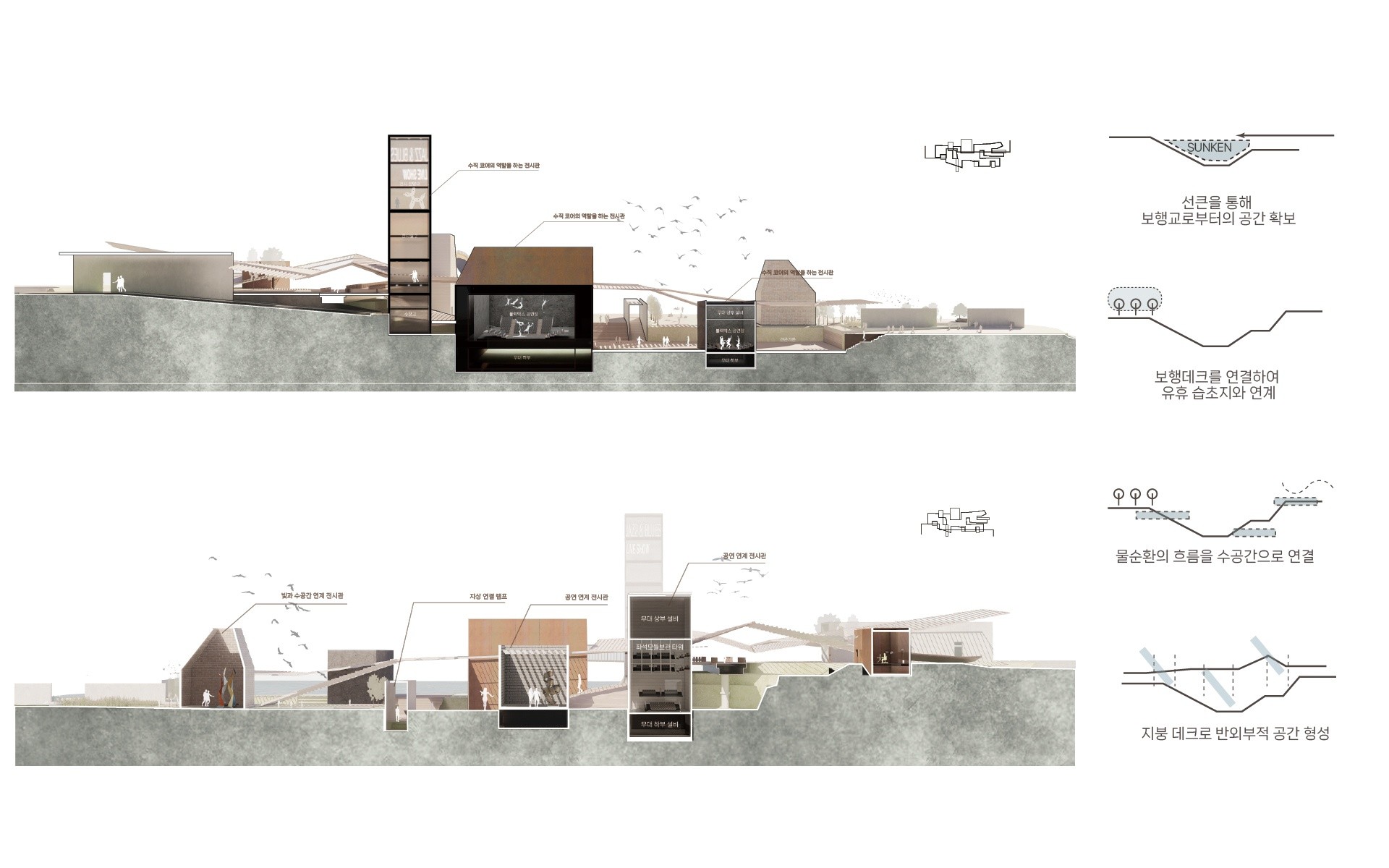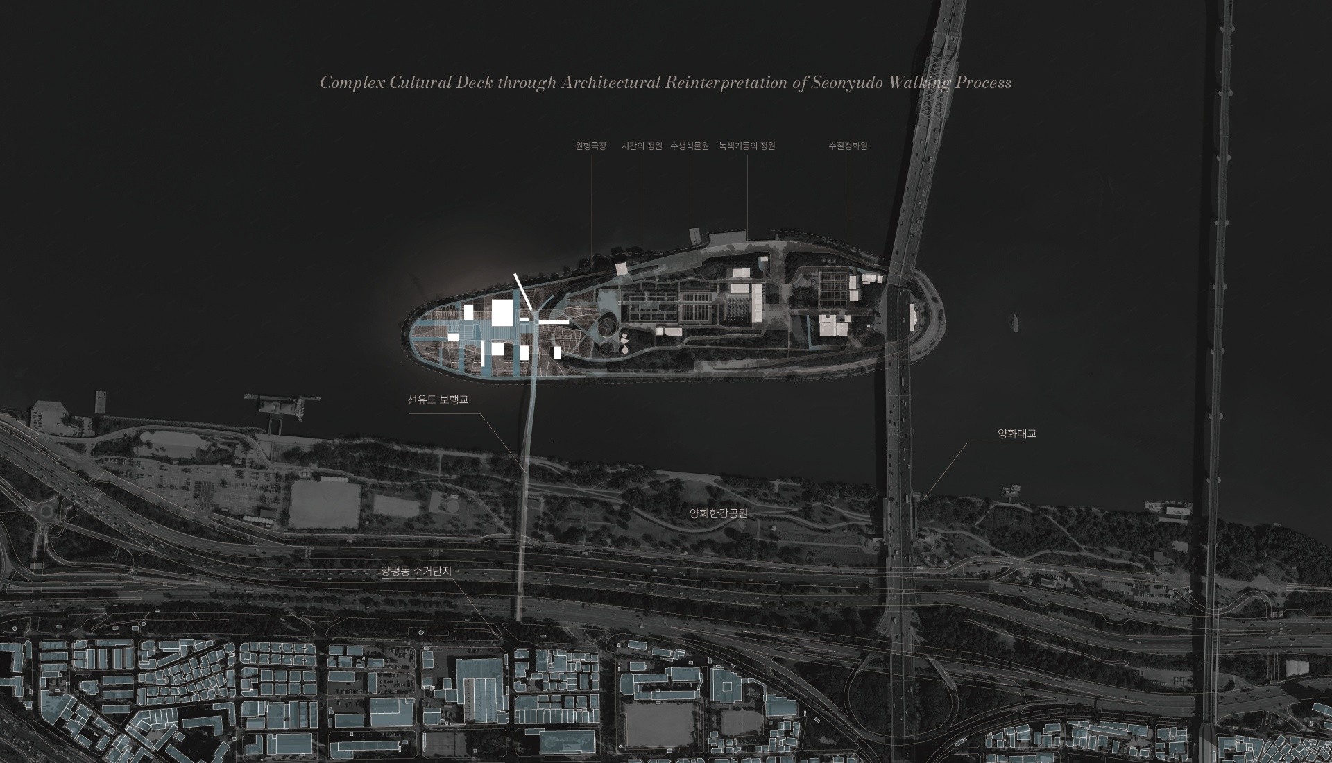 과거 정수장이었던 선유도는 건축적 재해석을 통해 공원으로 변모하였다. 기존 정수장이었던 대지의 컨텍스트를 유지하고자 했던 건축언어를 계승하여 현재 비워진 자생습초지에 문화의 켜를 더하고자 한다. 선유도의 고유성과 정체성을 유지하며 새로운 문화의 레이어를 중첩하여 다양성을 수용하고 공간의 경험자들에게 여러 위치에서 흔적을 포착하도록 하여 산책의 과정을 연장한다.