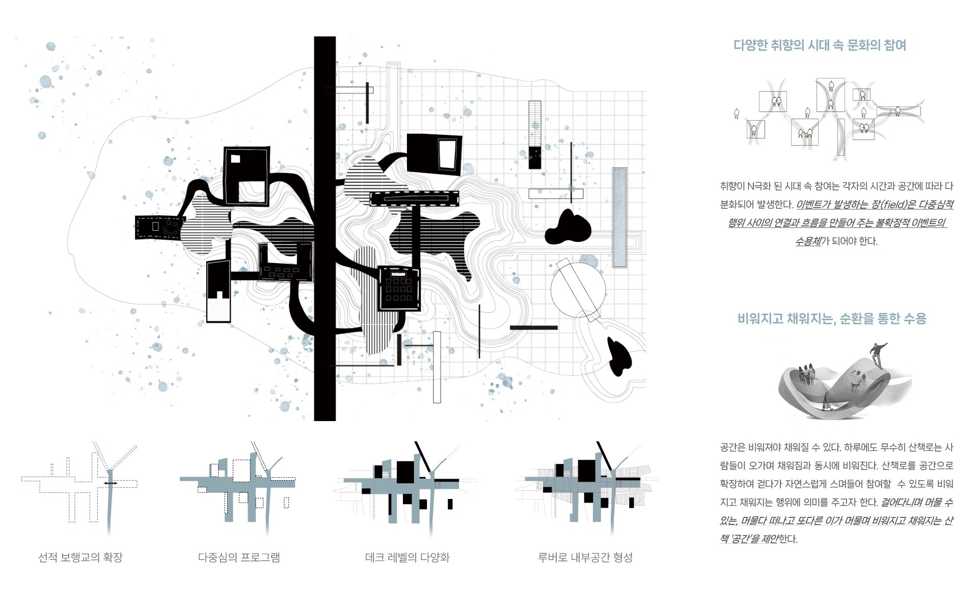 문화의 참여는 각자의 시간과 공간에 따라 다분화되어 발생하며, 이벤트가 발생하는 장(field)은 다중심적 행위 사이의 연결과 흐름을 만들어 주는 불확정적 이벤트의 수용체 가 되어야 한다. 한강 유일의 보행 연결섬인 선유도, 기존 산책이라는 단일 행위에 문화를 더해 보행교에서 사람들이 자신의 행위를 선택하며 풍부한 경험을 부여한다. 산책로를 공간으로 확장하여 걷다가 자연스럽게 스며들어 참여할 수 있도록 비워지고 채워지는 행위에 의미를 주고자 한다.
