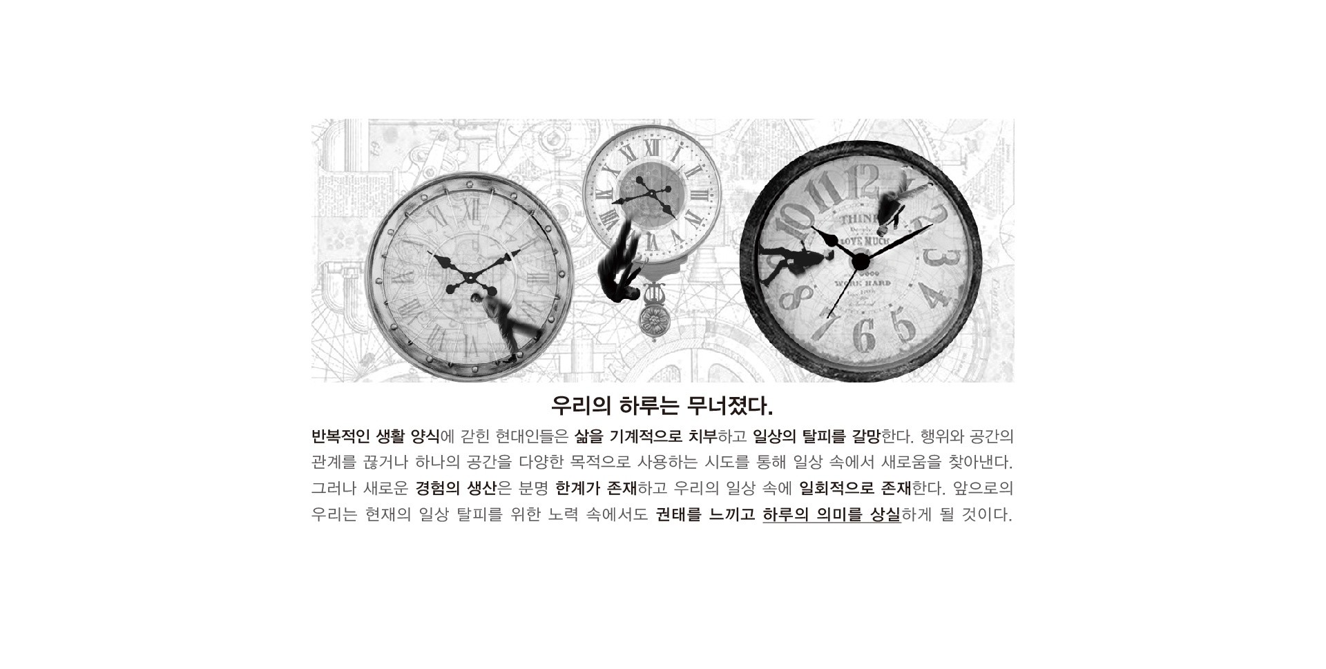 반복적인 생활 양식에 갇힌 현대인들은 삶을 기계적으로 치부하고 일상의 탈피를 갈망한다.