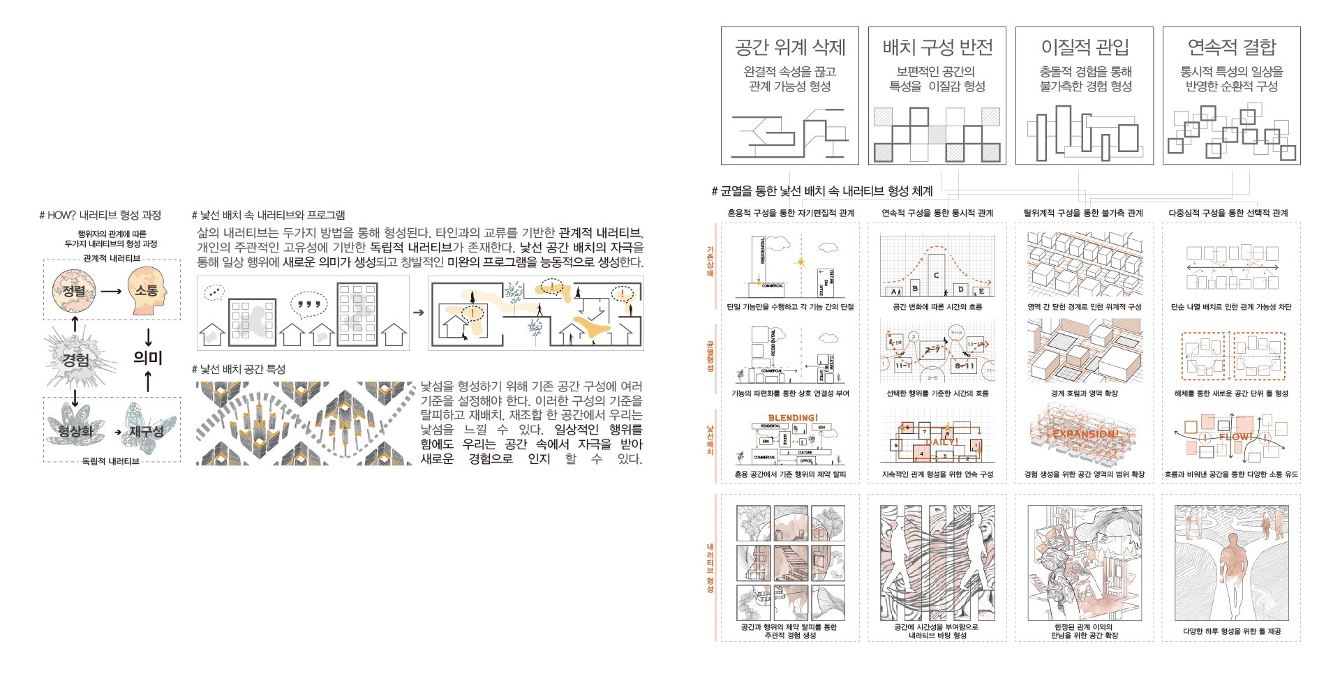 이를 위해 균열적 공간을 구성하였고 유연하고 낯설게 구성된 균열적 공간에서 행위자는 개인의 선택을 기준해 관계를 형성하고 하루의 반복을 탈피한다.
