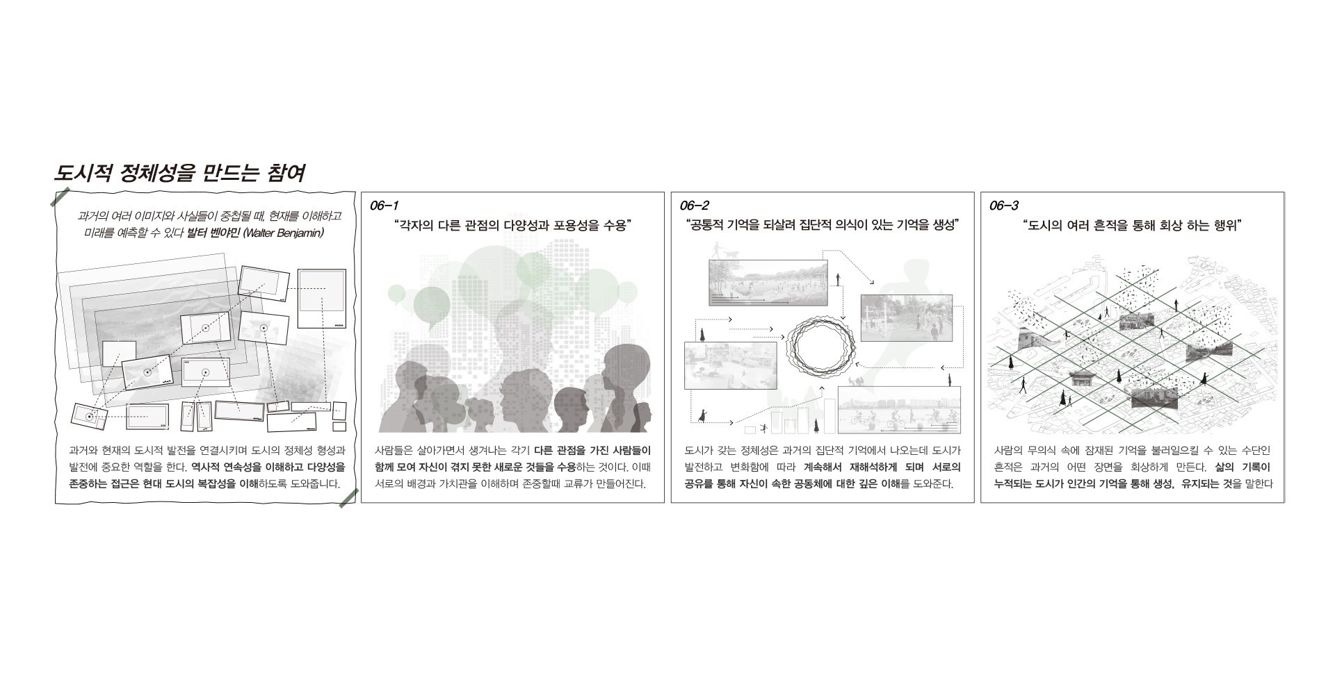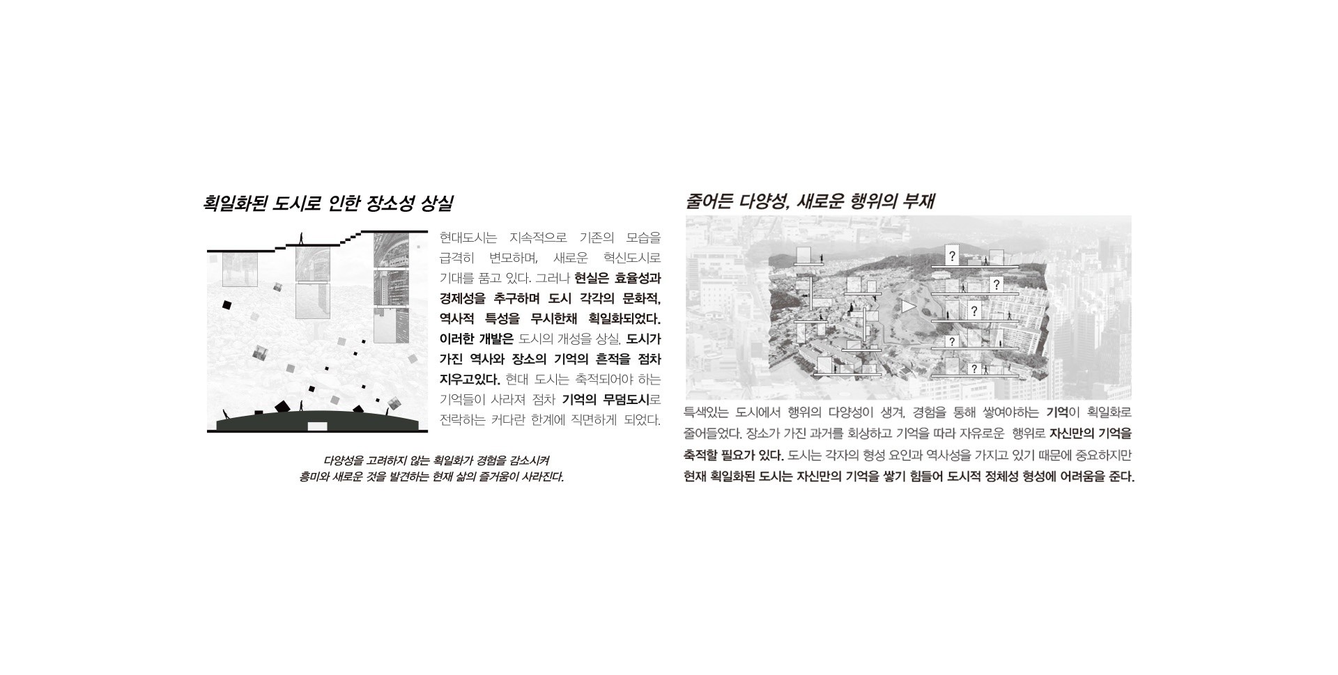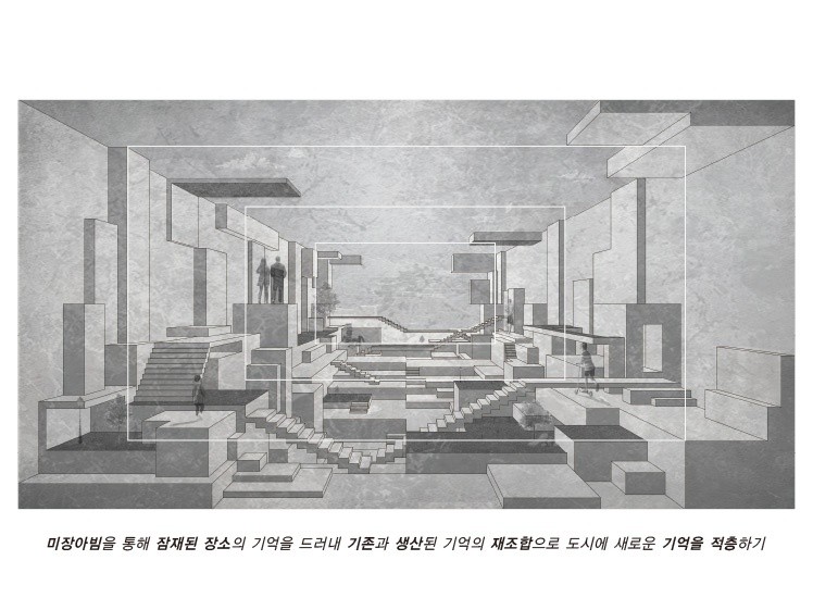 현대 도시는 지속적으로 기존의 모습을 급격히 변모하며, 새로운 혁신도시로 기대를 품고 있다. 장소의 다양성을 고려하지 않는 도심 획일화가 경험을 감소시켜 새로운 것을 발견하는 현재 삶의 즐거움이 줄어들었다. 장소가 가진 과거를 회상하고 기억을 따라 자유로운 행위로 자신만의 기억을 축적할 필요가 있다. 이후 시간이 지나면서 개별적인 기억들이 공유되어 집단 기억을 형성하는 참여의 과정을 통해 물리적인 장소를 넘어서 사회적 문화적으로 의미있는 장소가 되어 간다. 기존의 기억과 개입을 통한 새롭게 생산된 기억의 재조합은 잃어가는 과거만을 회복하는 것이 아닌 과거와 현재를 연결하여 미완의 지속적인 변화를 통해 도시의 장소성을 새롭게 쌓아가는 방향을 제시한다.