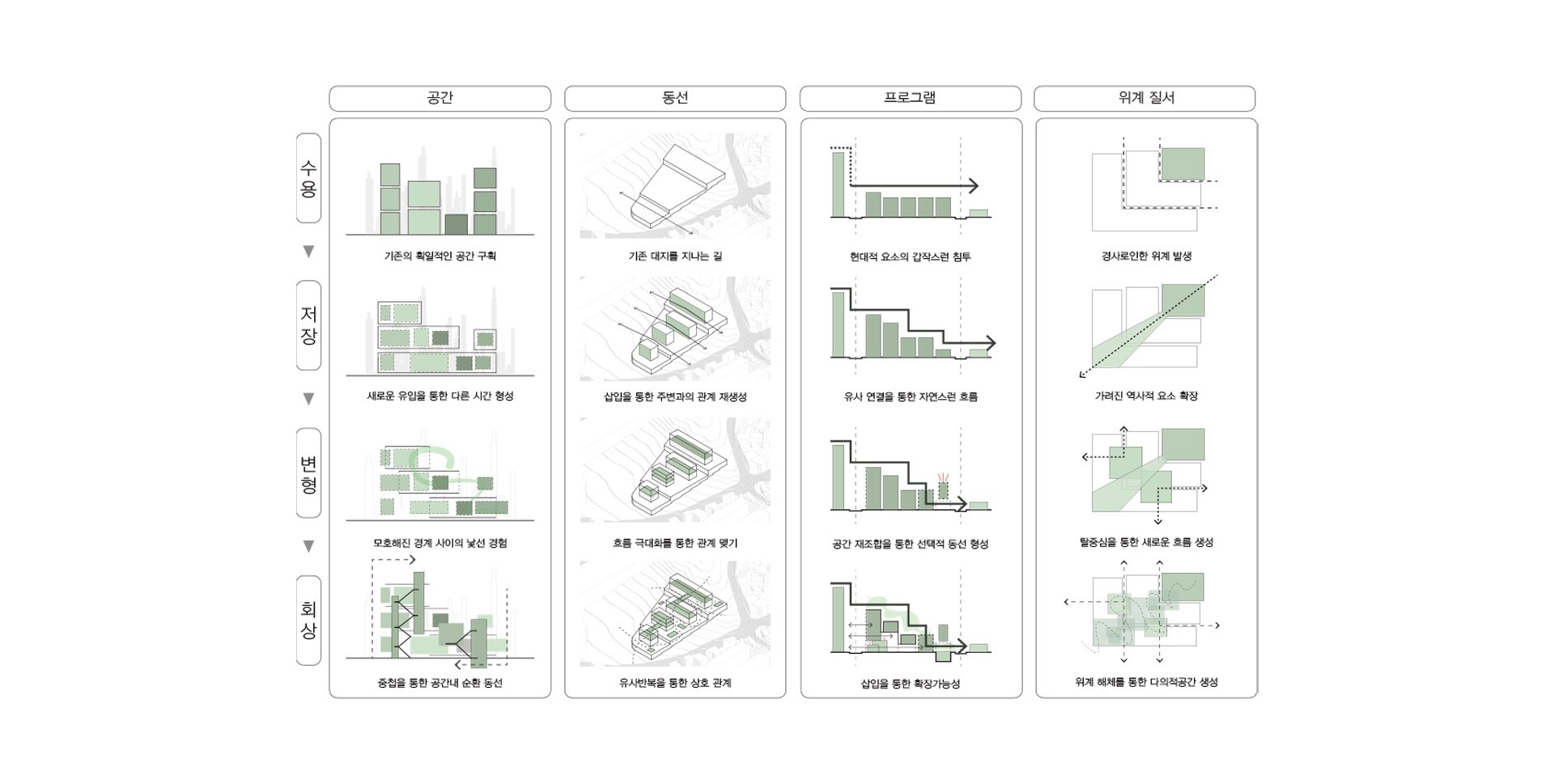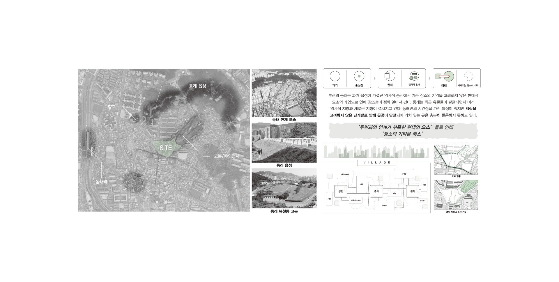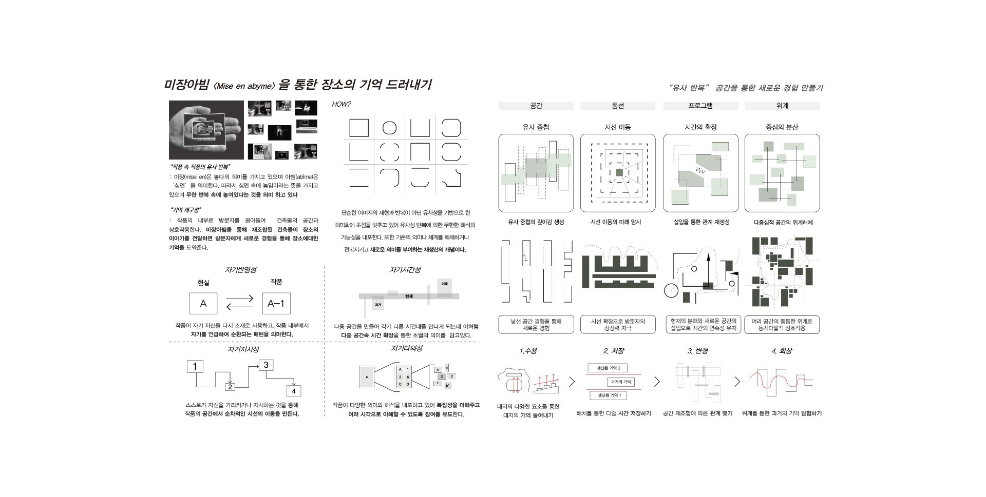 현대 도시는 지속적으로 기존의 모습을 급격히 변모하며, 새로운 혁신도시로 기대를 품고 있다. 장소의 다양성을 고려하지 않는 도심 획일화가 경험을 감소시켜 새로운 것을 발견하는 현재 삶의 즐거움이 줄어들었다. 장소가 가진 과거를 회상하고 기억을 따라 자유로운 행위로 자신만의 기억을 축적할 필요가 있다. 이후 시간이 지나면서 개별적인 기억들이 공유되어 집단 기억을 형성하는 참여의 과정을 통해 물리적인 장소를 넘어서 사회적 문화적으로 의미있는 장소가 되어 간다. 기존의 기억과 개입을 통한 새롭게 생산된 기억의 재조합은 잃어가는 과거만을 회복하는 것이 아닌 과거와 현재를 연결하여 미완의 지속적인 변화를 통해 도시의 장소성을 새롭게 쌓아가는 방향을 제시한다.