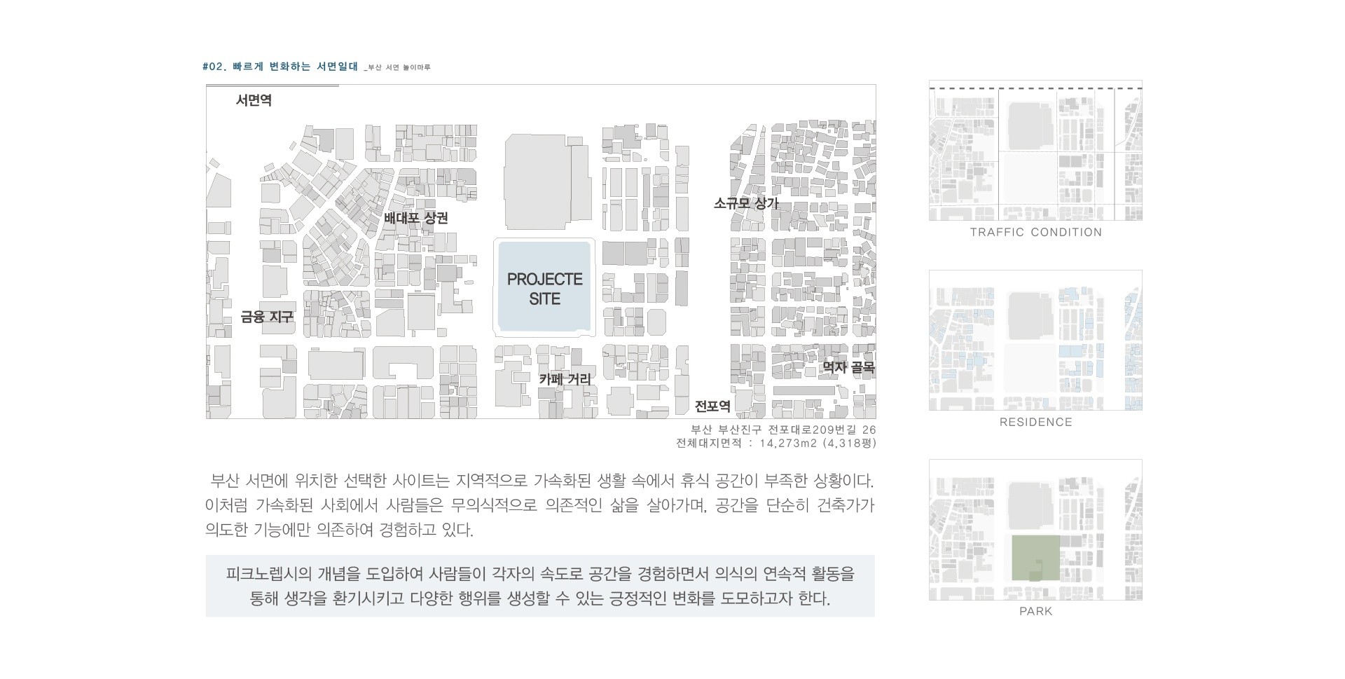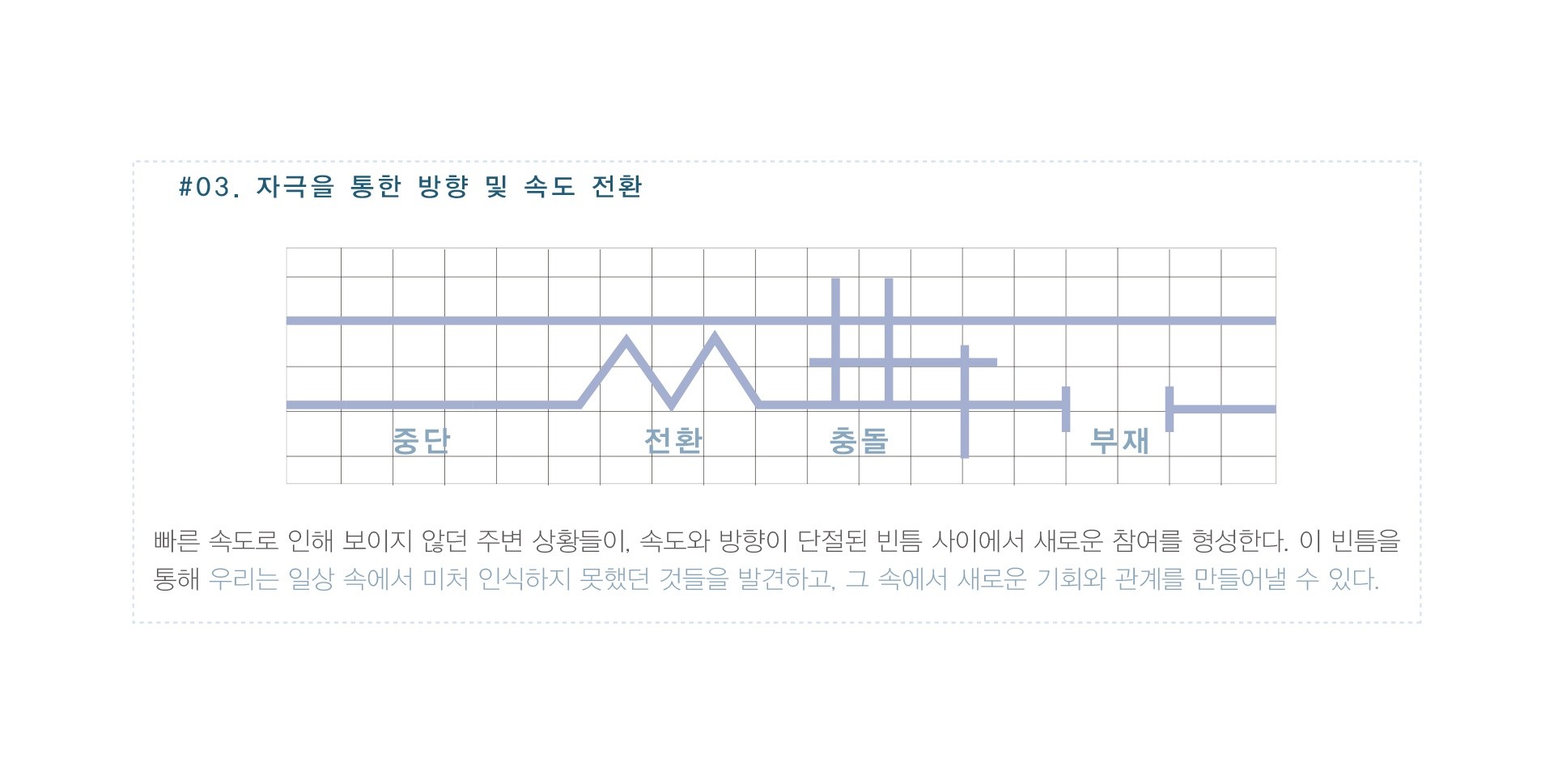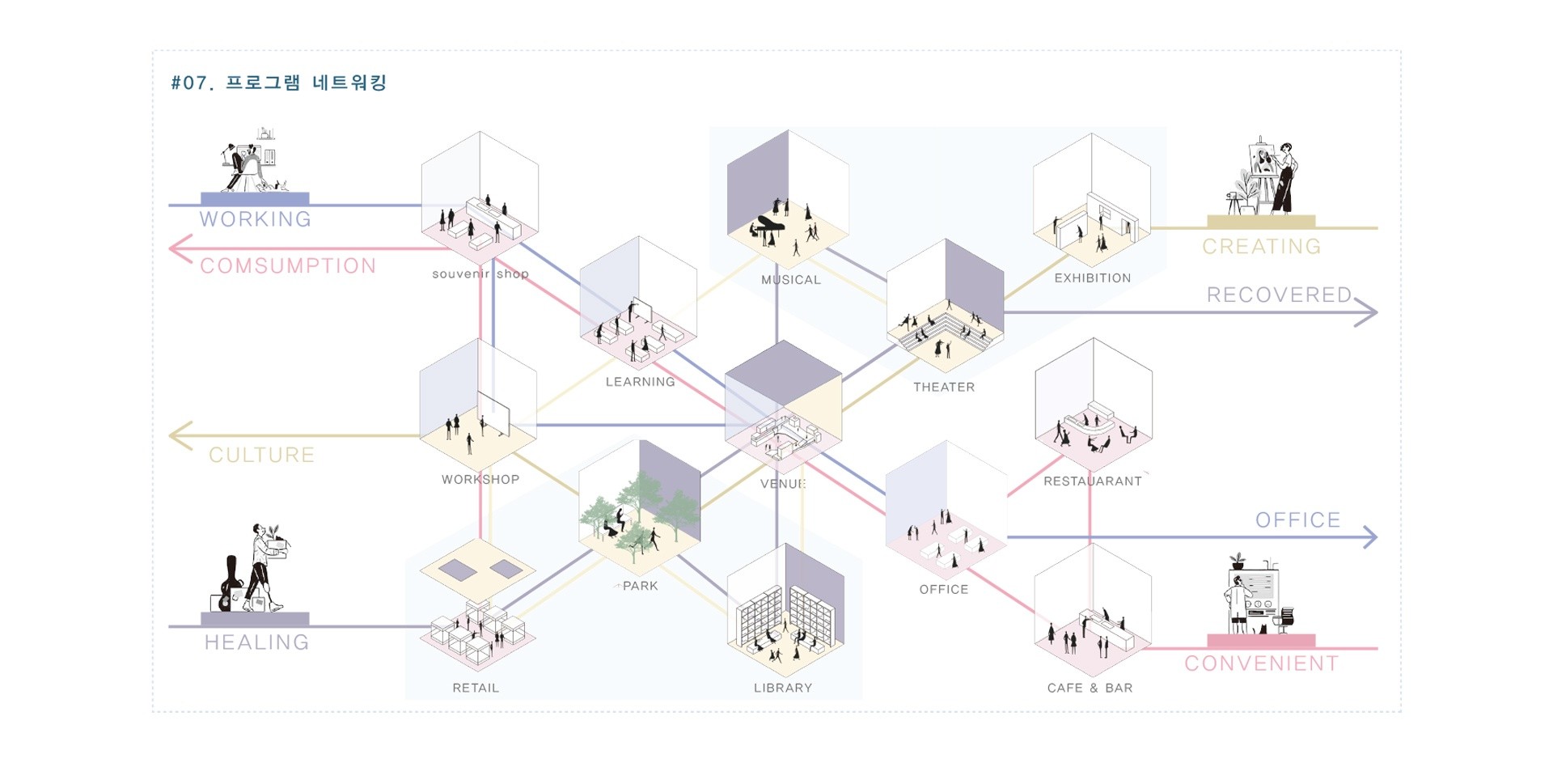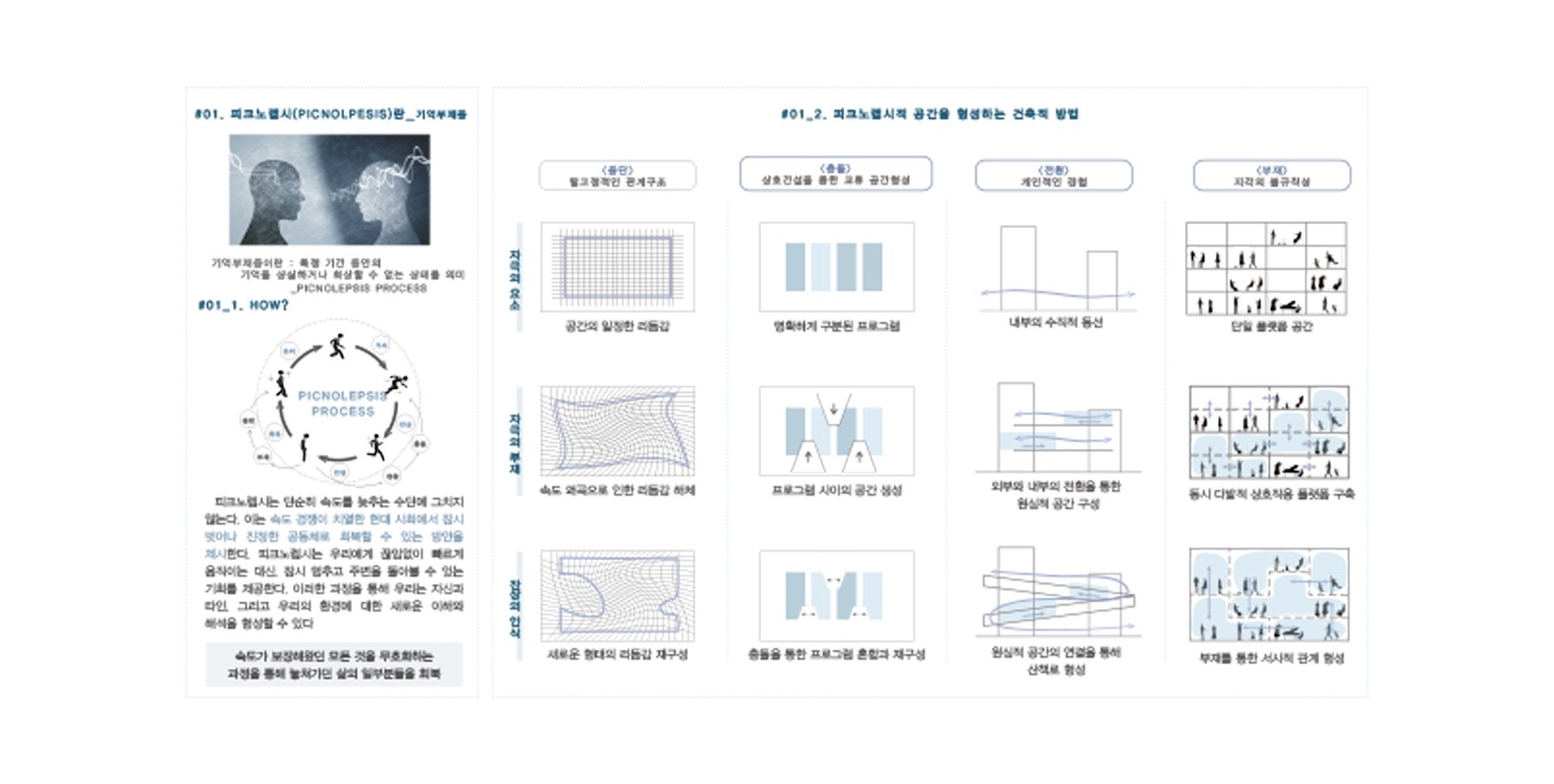 경험하도록 유도하는 이론이다. 이러한 단절을 통해 일상적인 사고의 흐름에서 벗어나 창의적이고 몰입적인 경험을 가능하게 한다. 피크노렙시를 적용한 공간은 사용자가 공간과 적극적으로 상호작용하면서 자신만의 이야기를 담아낼 수 있는 주체적 경험을 가능하게 하고, 이는 공간에 대한 더 딮이 있는 이해와 감정을 형성하게 만든다.