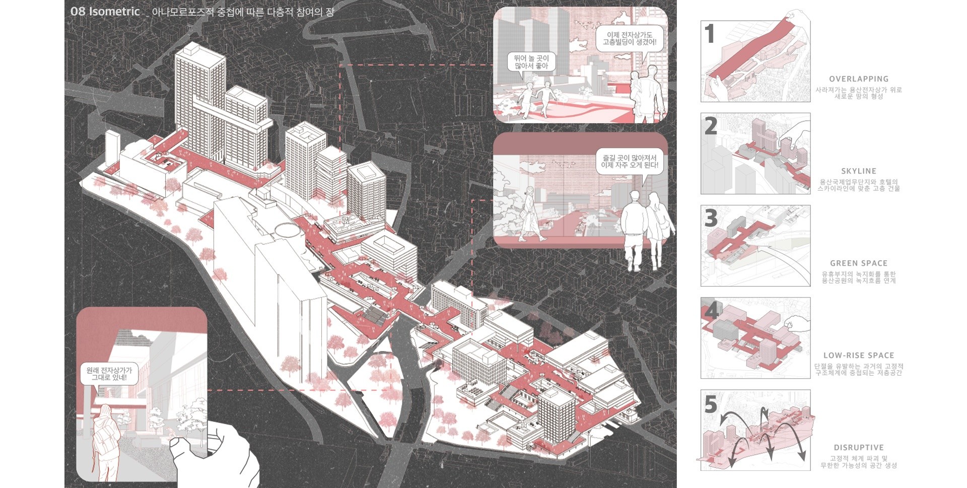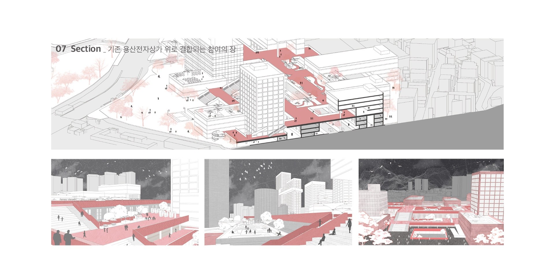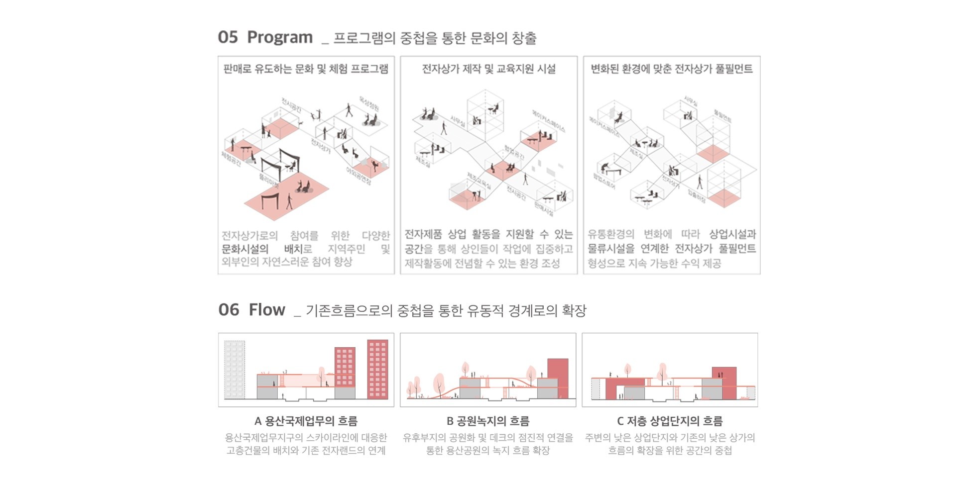 판과 공간, 프로그램을 중첩시켜 기존 용산전자상가의 정체성을 유지하면서도, 변화하는 시대에 맞춰 새로운 문화를 창출해낸다. 이러한 변화는 고정된 경계를 넘어 유동적인 경계로 확장되어, 사람들의 자발적인 참여를 유도하고 용산전자상가의 지속적인 발전을 촉진한다.