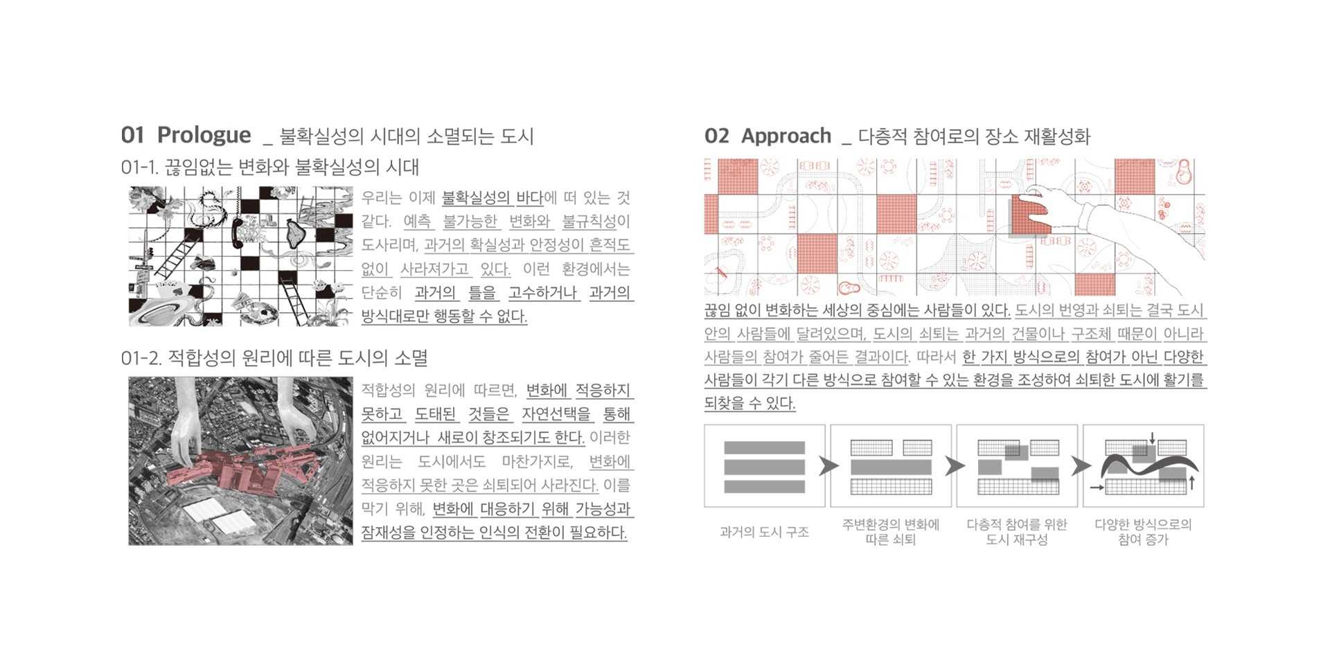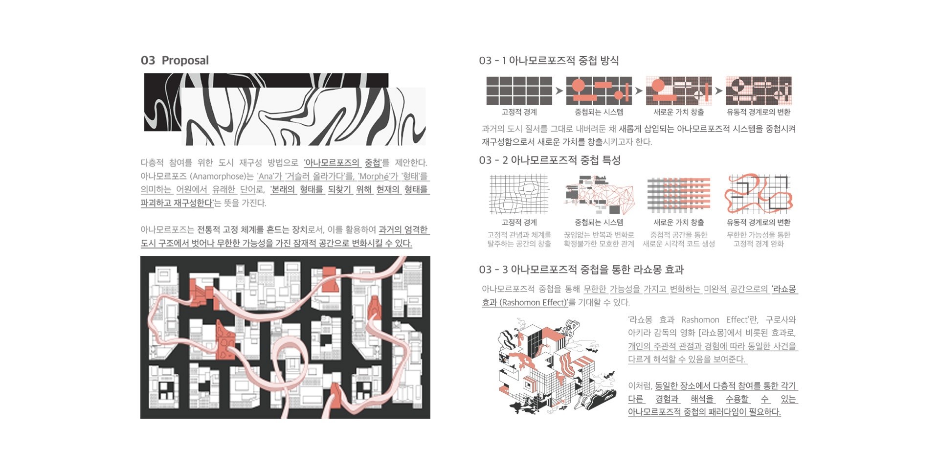 기존의 틀을 과감히 벗어나, 아나모르포즈적 중첩을 통해 고정된 체계를 해체하고, 변화에 유연하게 적응할 수 있는 '미완의 공간'을 제안한다. 이 공간은 완성된 형태가 아닌, 끊임없이 변화하고 재구성될 수 있는 유동적인 환경을 지향한다.