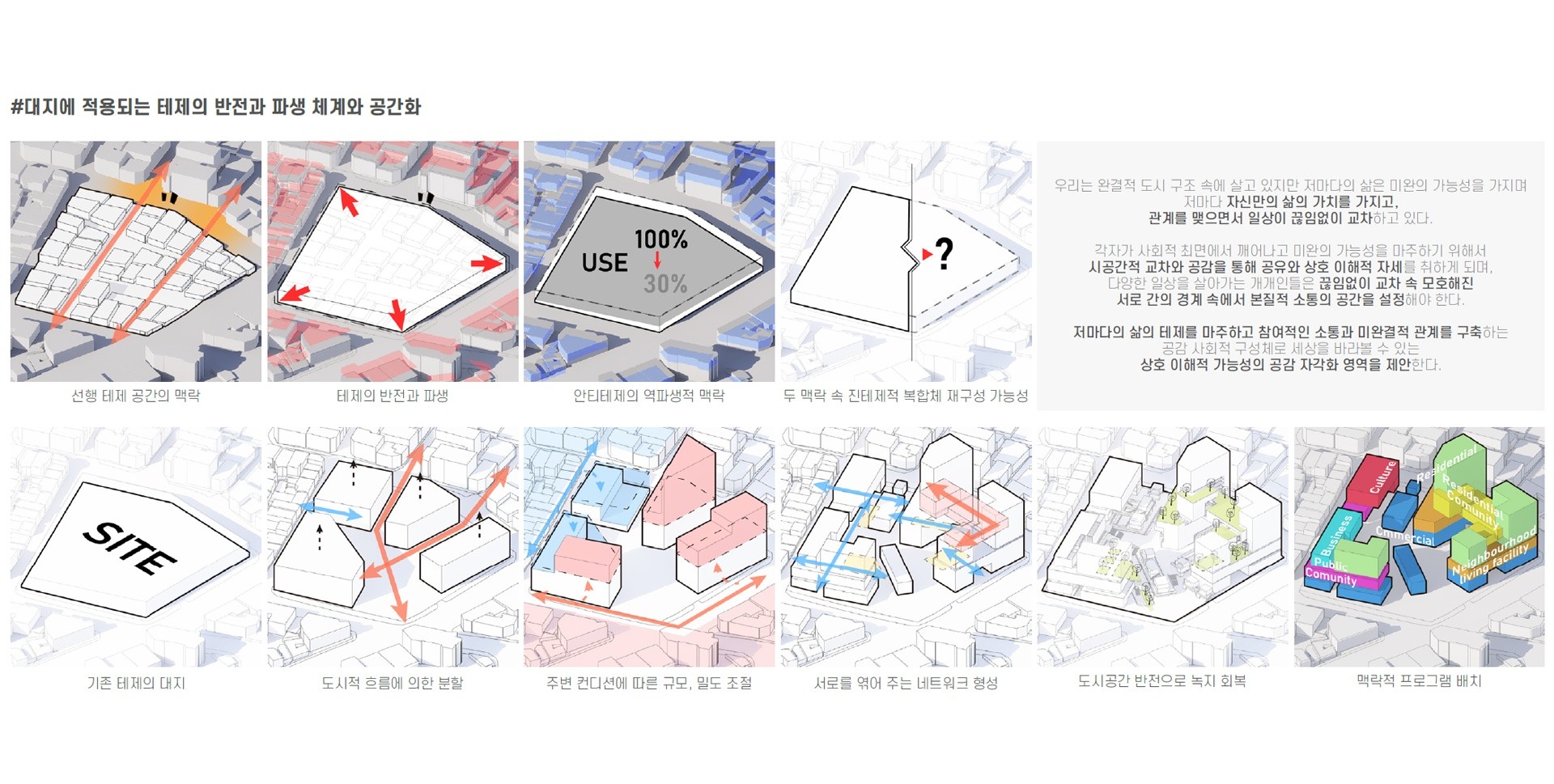 비대해지는 도시를 소형화된 고밀도 클러스터로 만들고, 빈 곳을 녹지로 되돌리는, 기존 환경으로부터 반전파생적 체계 재구성을 통해 삶의 질적 환경을 개선하고, 이 사이에 형성된 네트워크를 통해 가까워진 서로의 거리 속에서 능동적으로 새로운 관계 형성에 참여할 수 있는 장소를 만든다.