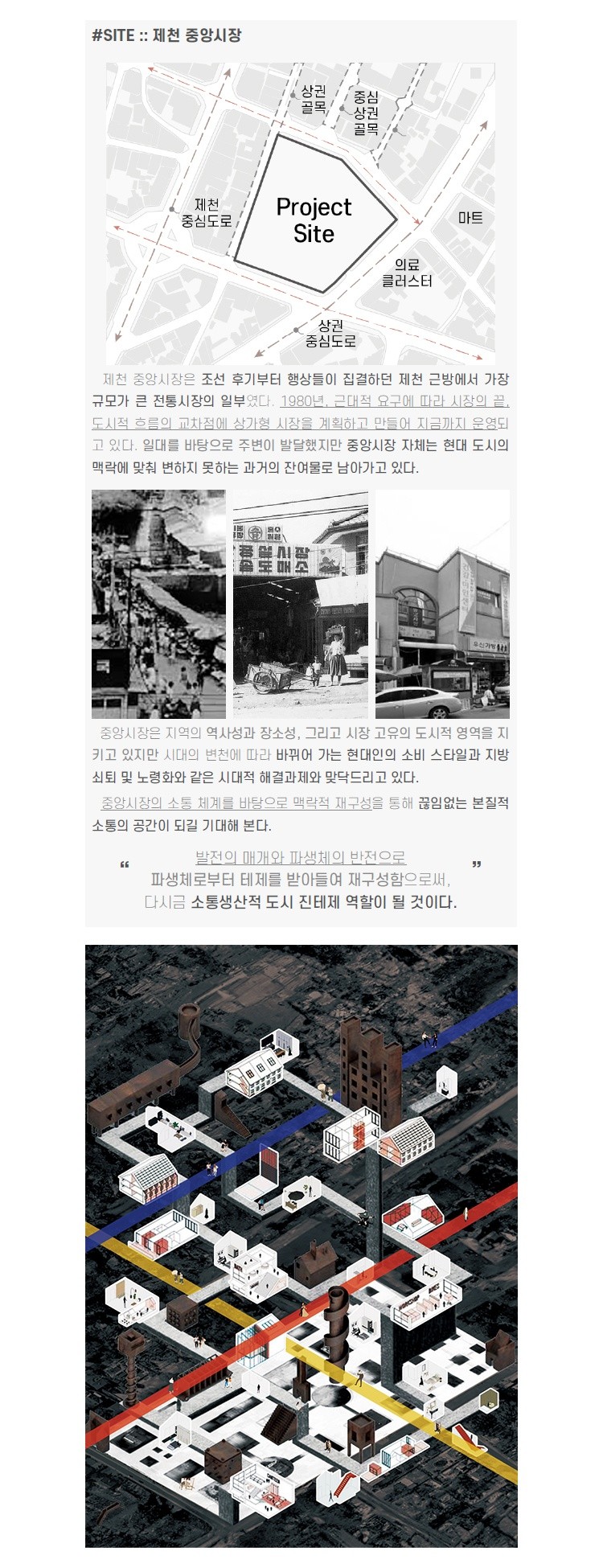 도시의 도로 틀 속에서 기존 시장 흐름을 중심 주변 상업시설과의 체계적 관계성에 따라 클러스터의 밀도와 규모를 조절하여
