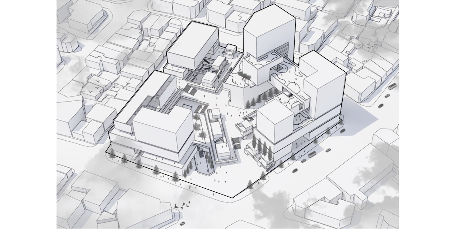 각각의 도시적 파사드에 대응하는 클러스터의 진입부의 문화시설을 따라 중심에 존재하는 이너코트와 연결되고, 클러스터 전반적인 네트워크를 형성한다.
