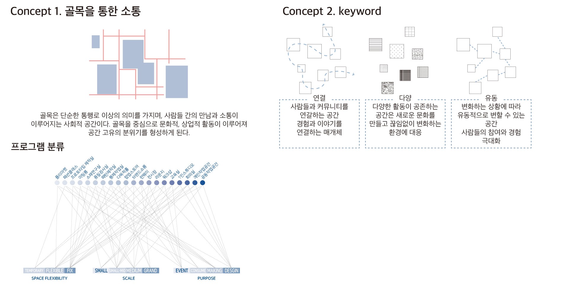 연결성, 다양성, 유동성을 핵심 개념으로 하여, 사람들이 자유롭게 공간을 탐험하고 참여할 수 있다.