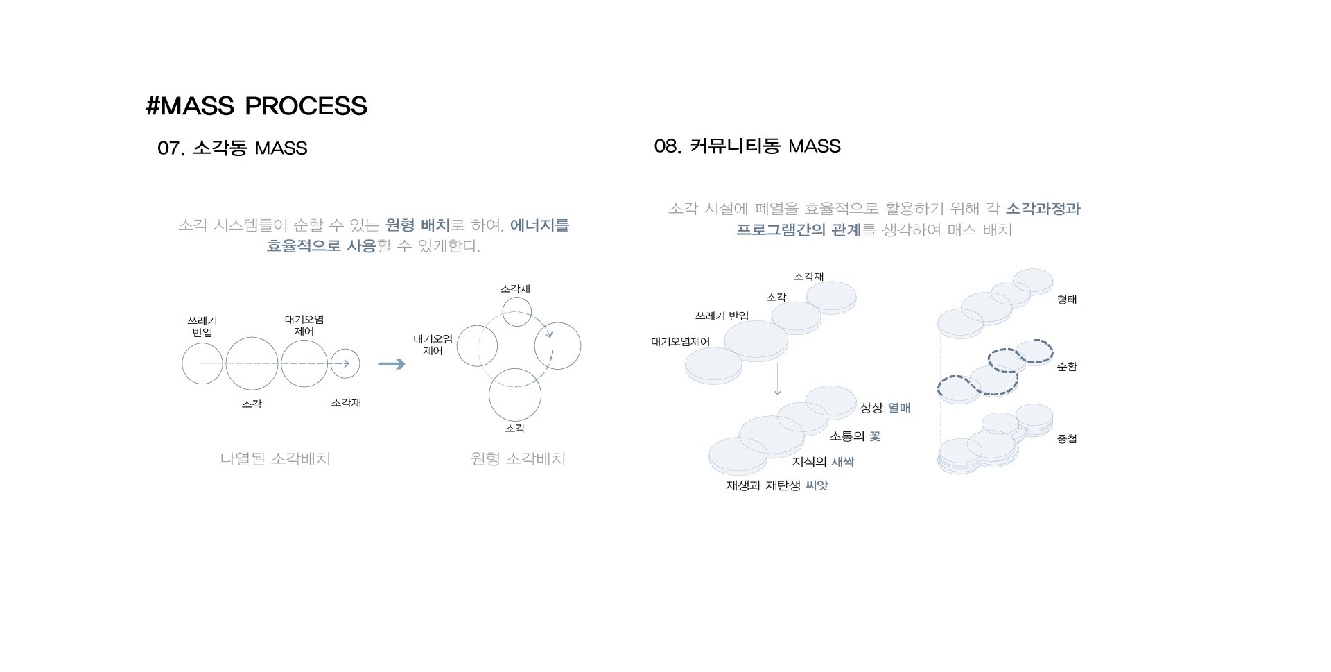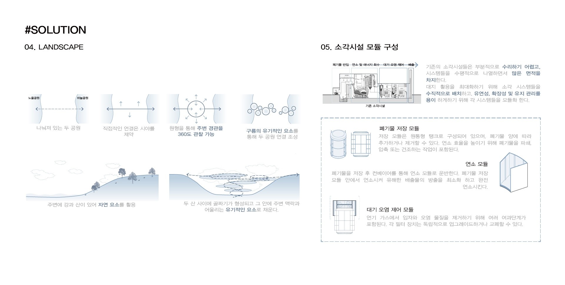 새로 지어지는 소각시설들은 소각시설 지하화와 주민 편익 시설을 제공한다고 한다. 하지만 이러한 방법들은 사람들이 소각시설을 친근하게 다가가기 매우 어렵다고 생각하여, 사람들의 참여를 수용하고 친화적인 경험으로 이미지를 재구성될 수 있는 소각시설이 필요하다. 소각시설을 지상화하고 시대의 흐름을 수용한 모듈형 소각시설을 프로토타입으로 제안하려고 한다.