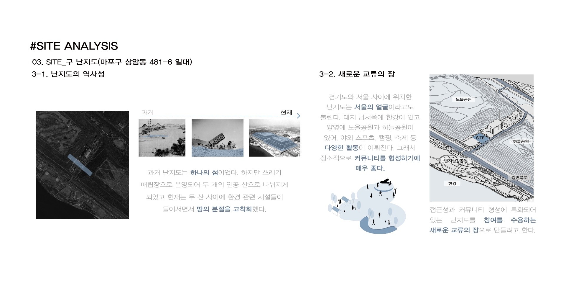 사이트는 과거 난지도였던 올림픽공원이다. 난지도는 과거 쓰레기 매립장으로 운영되어 두 개의 인공 산으로 나눠지게 되었고 현재는 두 산 사이에 환경 관련 시설들이 들어서면서 땅의 분절을 고착화했다.