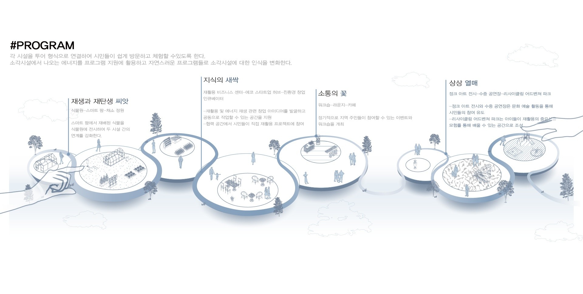 분절된 대지를 연결시켜 과거 난지도의 땅을 재생시킨다. 또한 소각시설에서 나오는 에너지를 활용하여 여러 활동을 시민들에게 제공하고, 소각시설에 대한 인식을 개선시킨다.