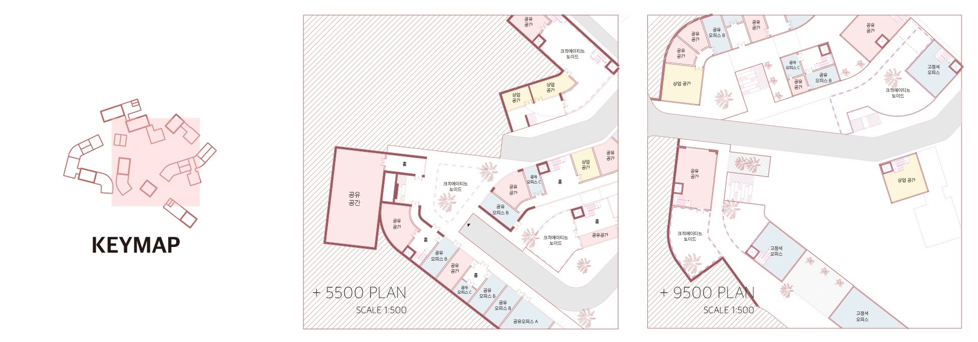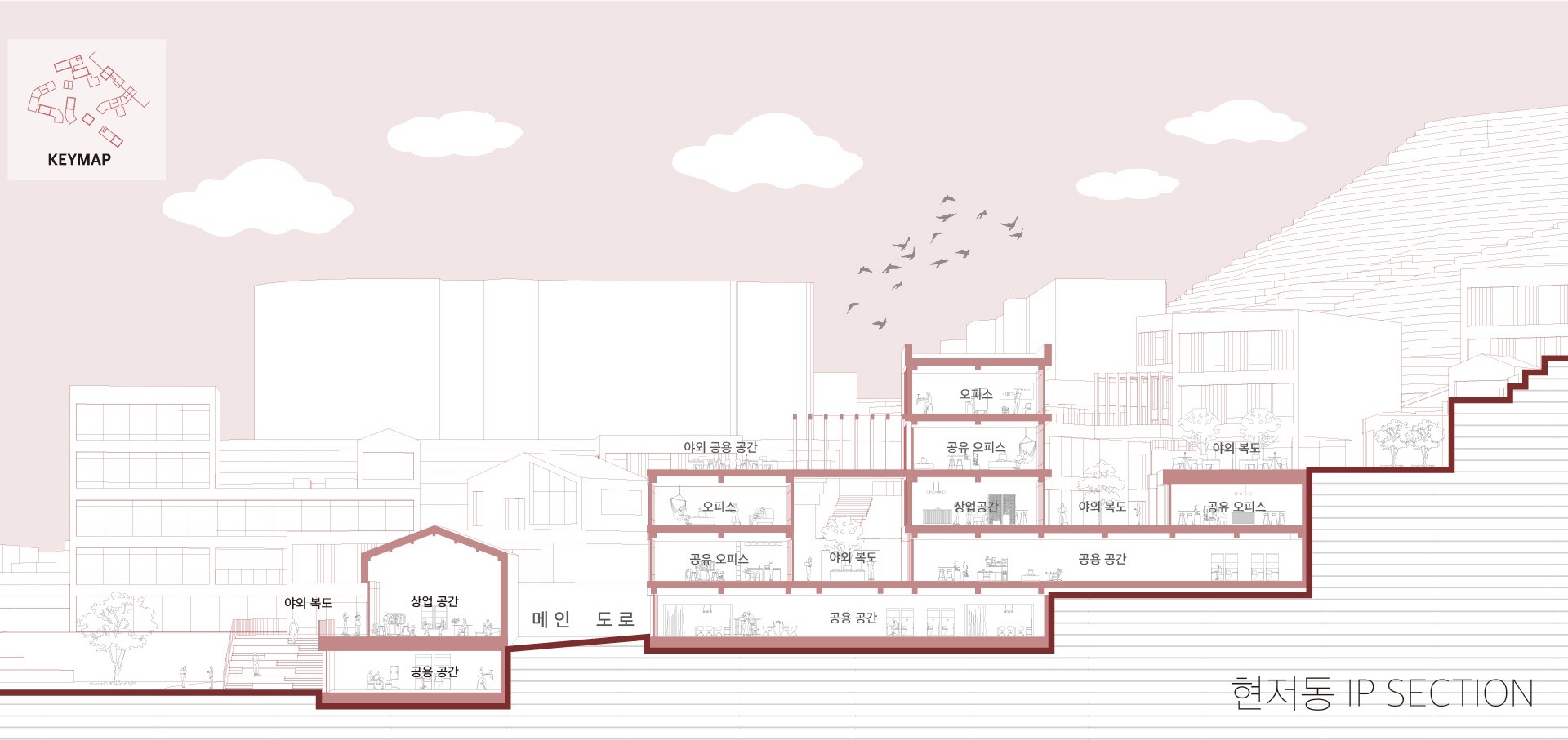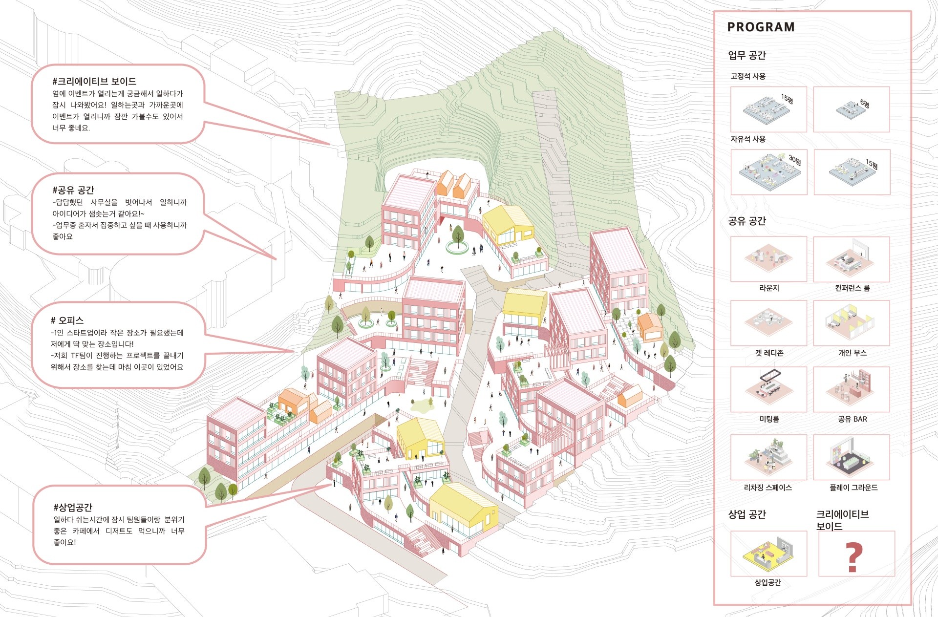 프로그램이 압축된 수직 단일건물 대신, 수평적으로 관계를 맺을 수 있는 경사진 마을형 크리에이티브 오피스를 제안한다. 또한 외부 공간 요소를 도입해 이용자 간의 상생과 인큐베이팅을 촉진하며, 역동성과 친근감을 더해 새로운 가치를 지닌 업무 환경을 제공한다.