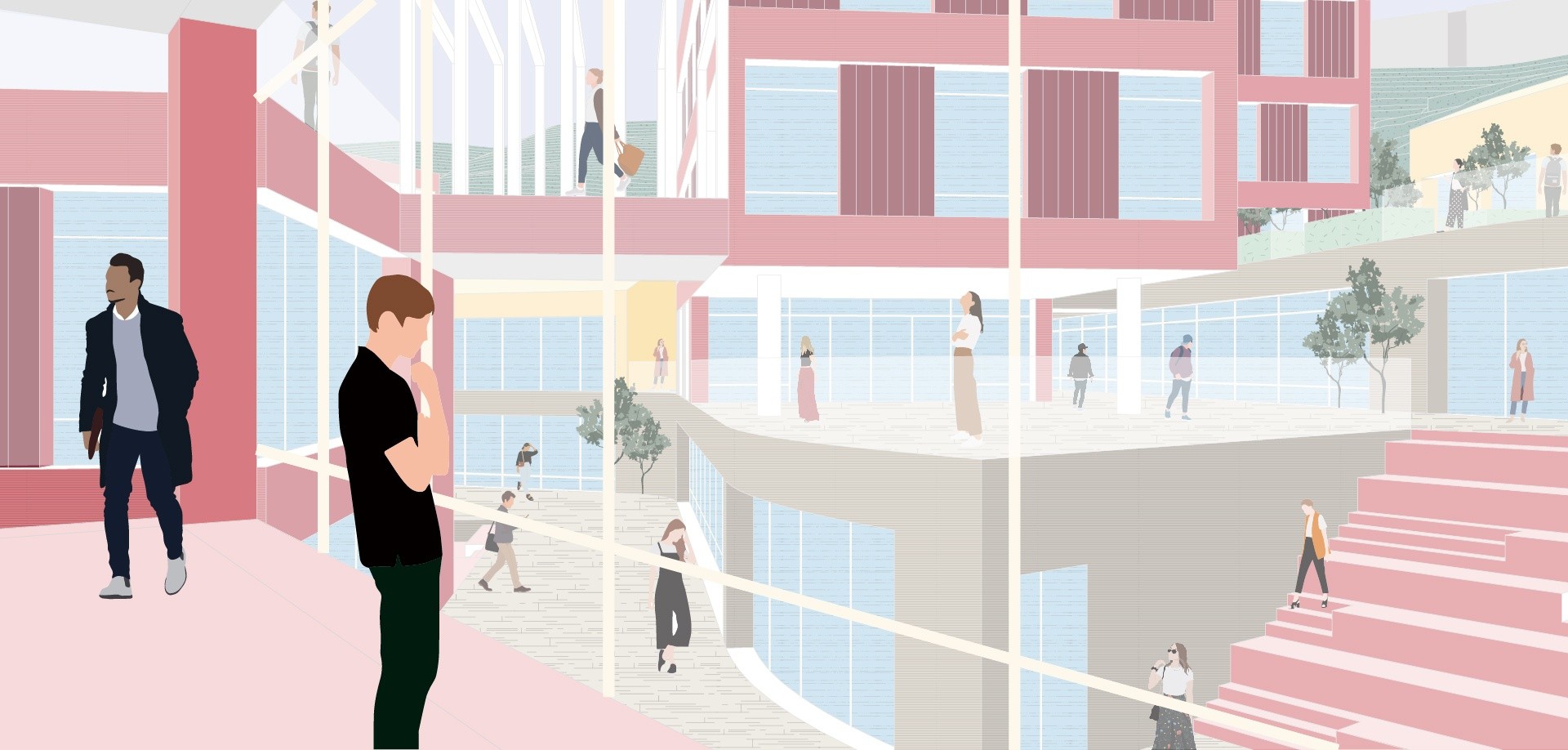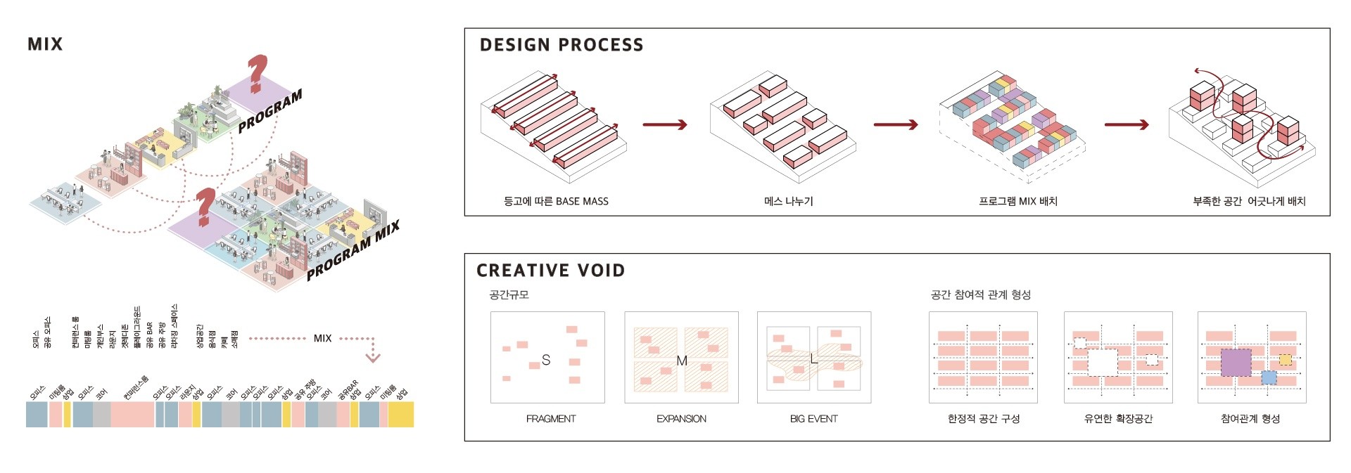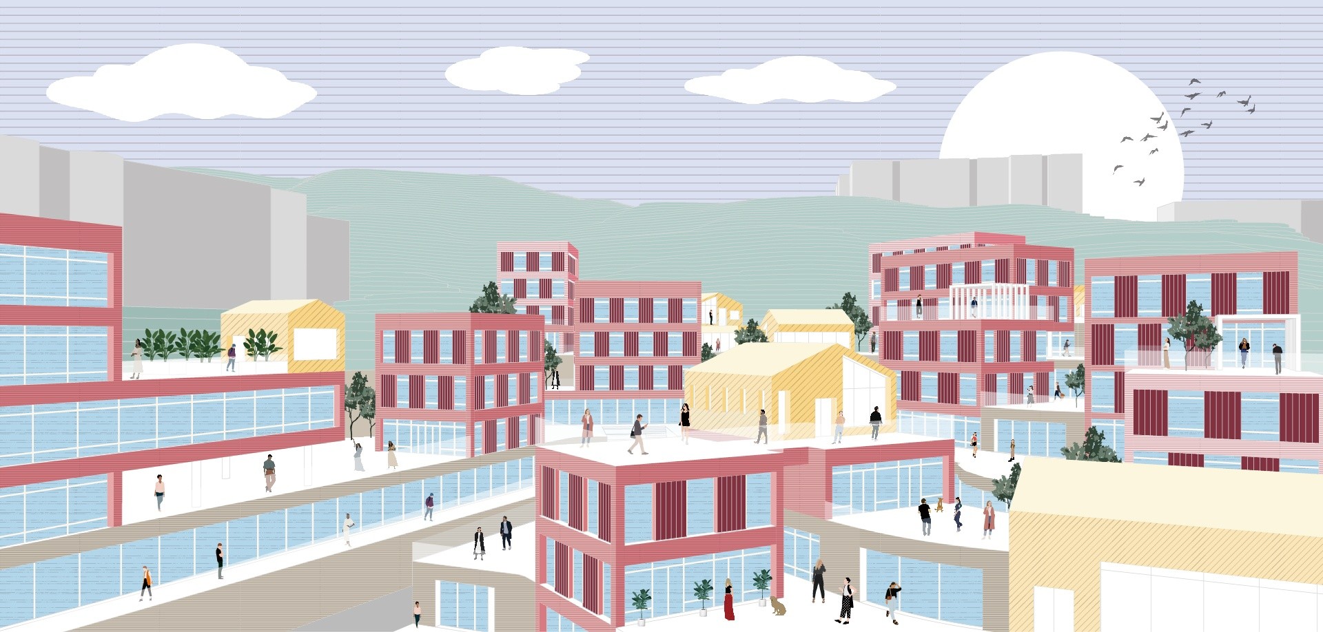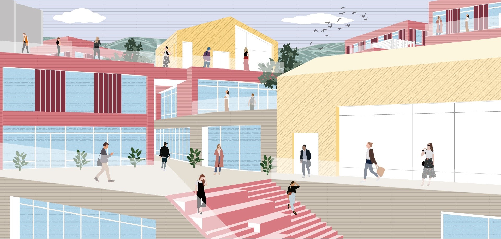 프로그램이 압축된 수직 단일건물 대신, 수평적으로 관계를 맺을 수 있는 경사진 마을형 크리에이티브 오피스를 제안한다. 또한 외부 공간 요소를 도입해 이용자 간의 상생과 인큐베이팅을 촉진하며, 역동성과 친근감을 더해 새로운 가치를 지닌 업무 환경을 제공한다.