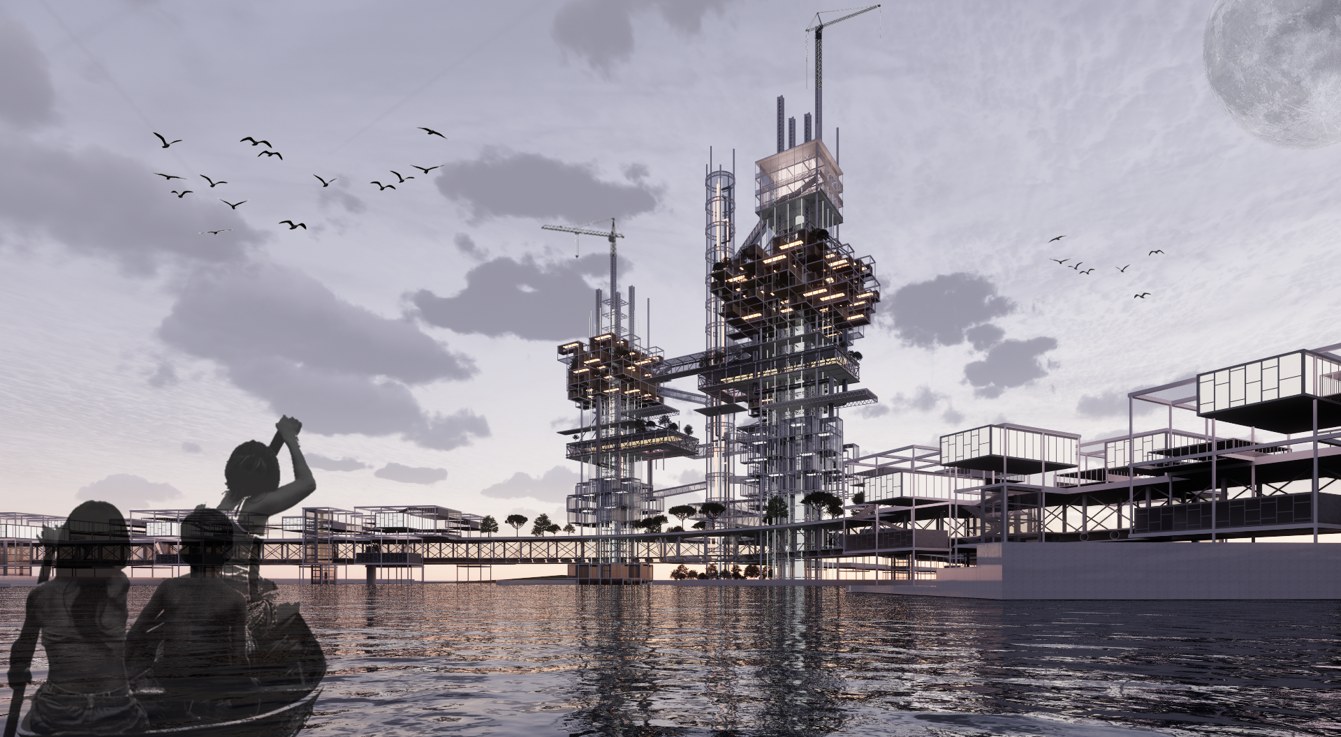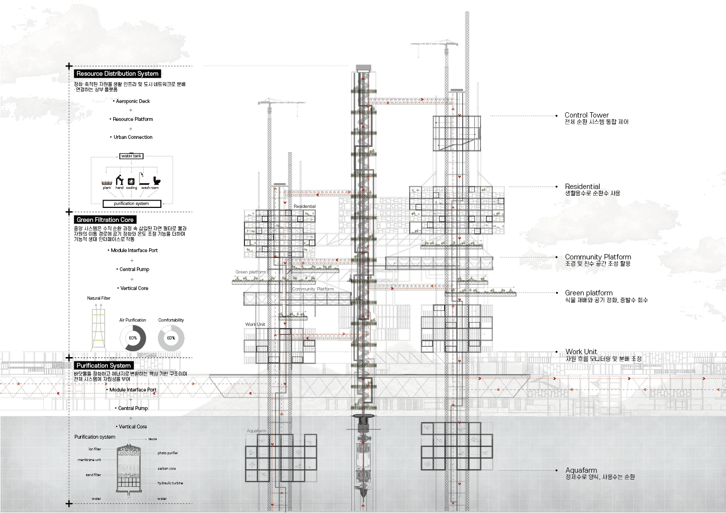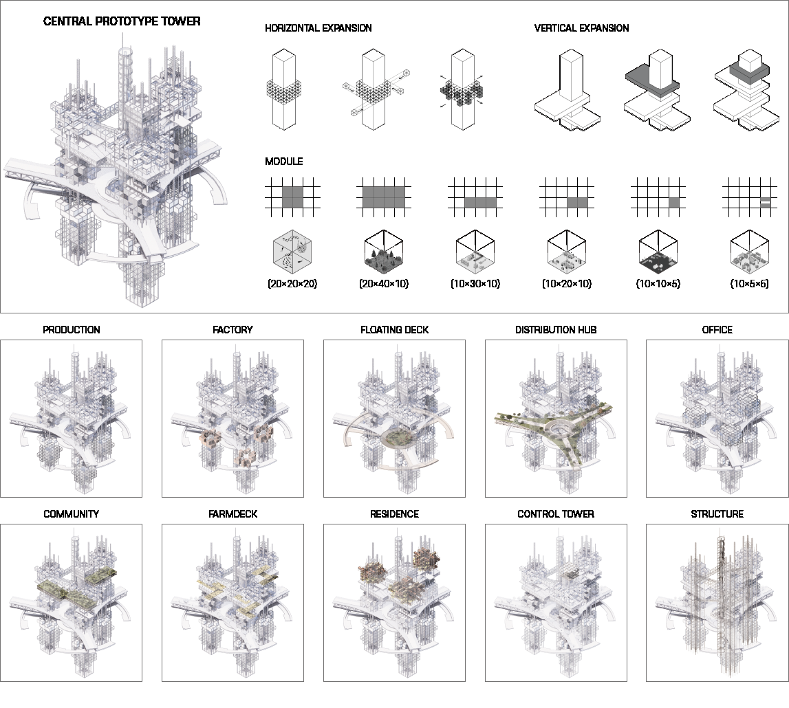 도시는 더 이상 육지 위에 고정된 존재가 아니라 물 위로 확장하고 변화에 적응하는 유기적 시스템이어야 한다. 새로운 프로토타입은 수직·수평으로 확장 가능한 가변형 구조로 설계되었으며 기능의 이동과 추가, 해체가 자유롭게 이루어진다.