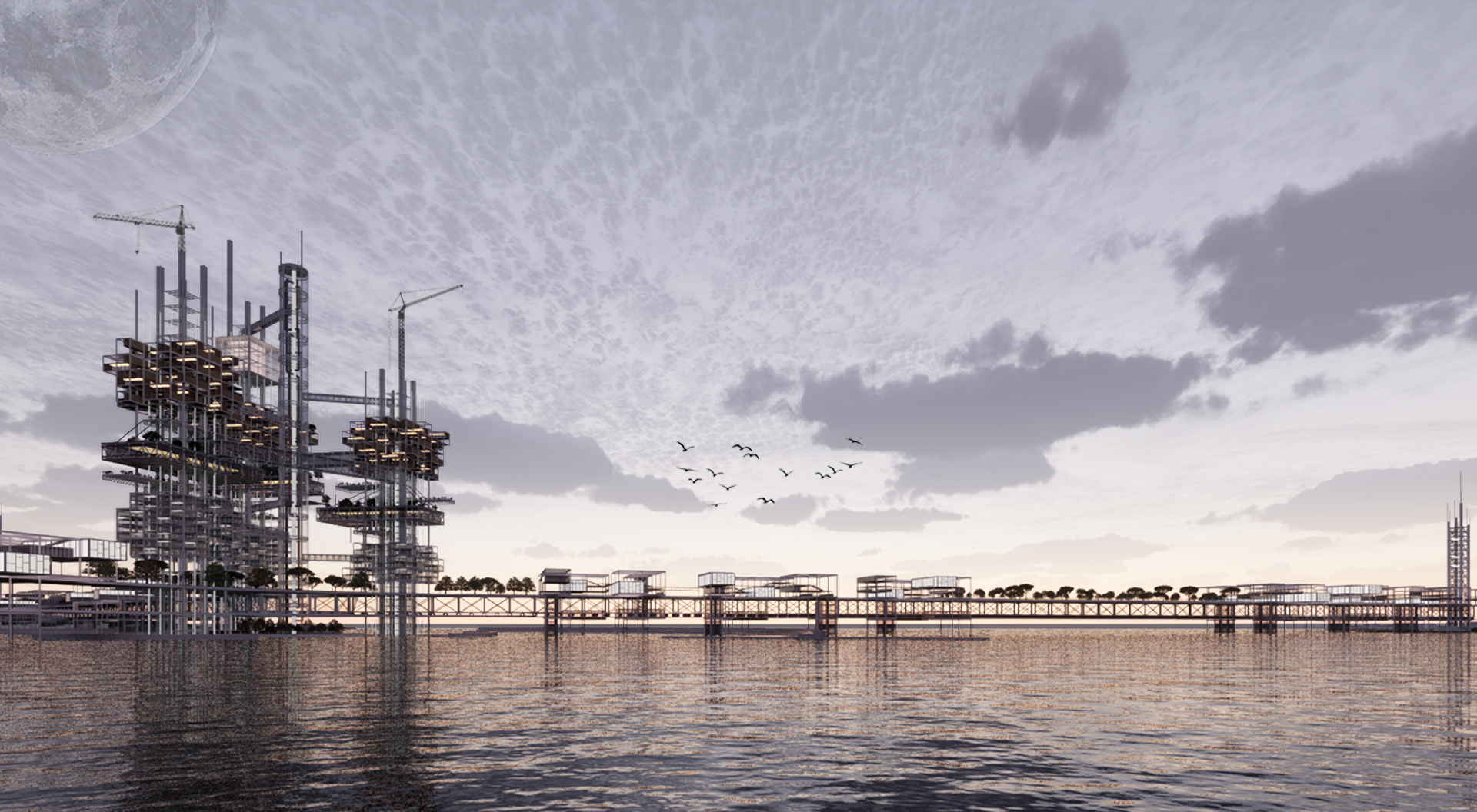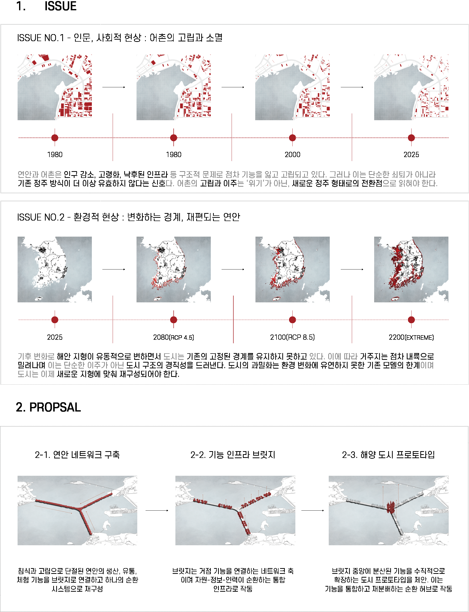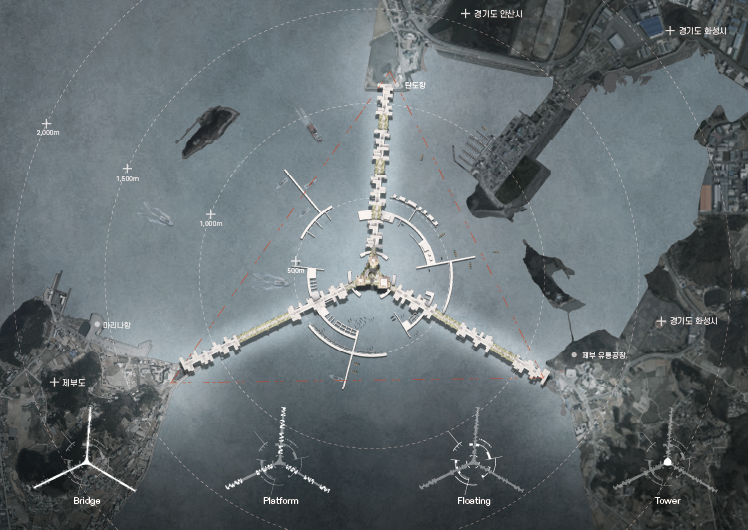 환경 변화로 인해 기능을 잃어가는 연안 어촌의 현실에 대응하여 본 프로젝트는 흩어진 거점을 기능별로 재편하고 이를 순환형 브릿지 인프라로 연결하는 새로운 해양 도시 프로토타입을 제안한다.