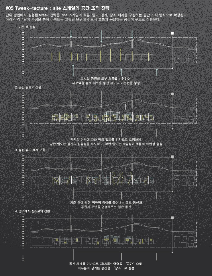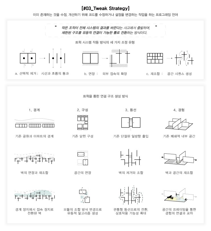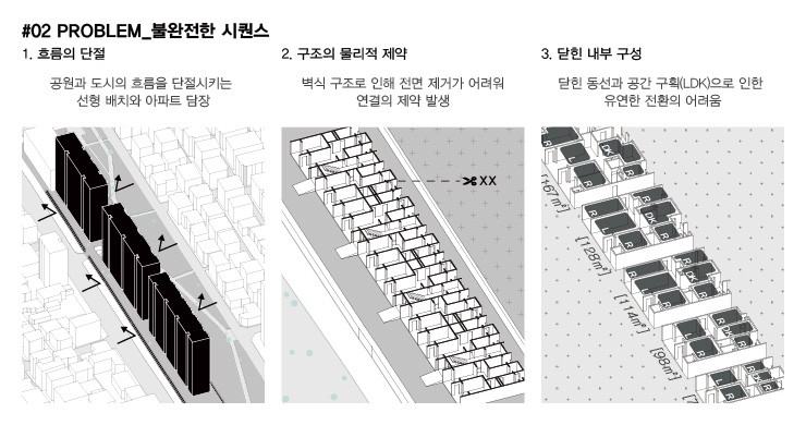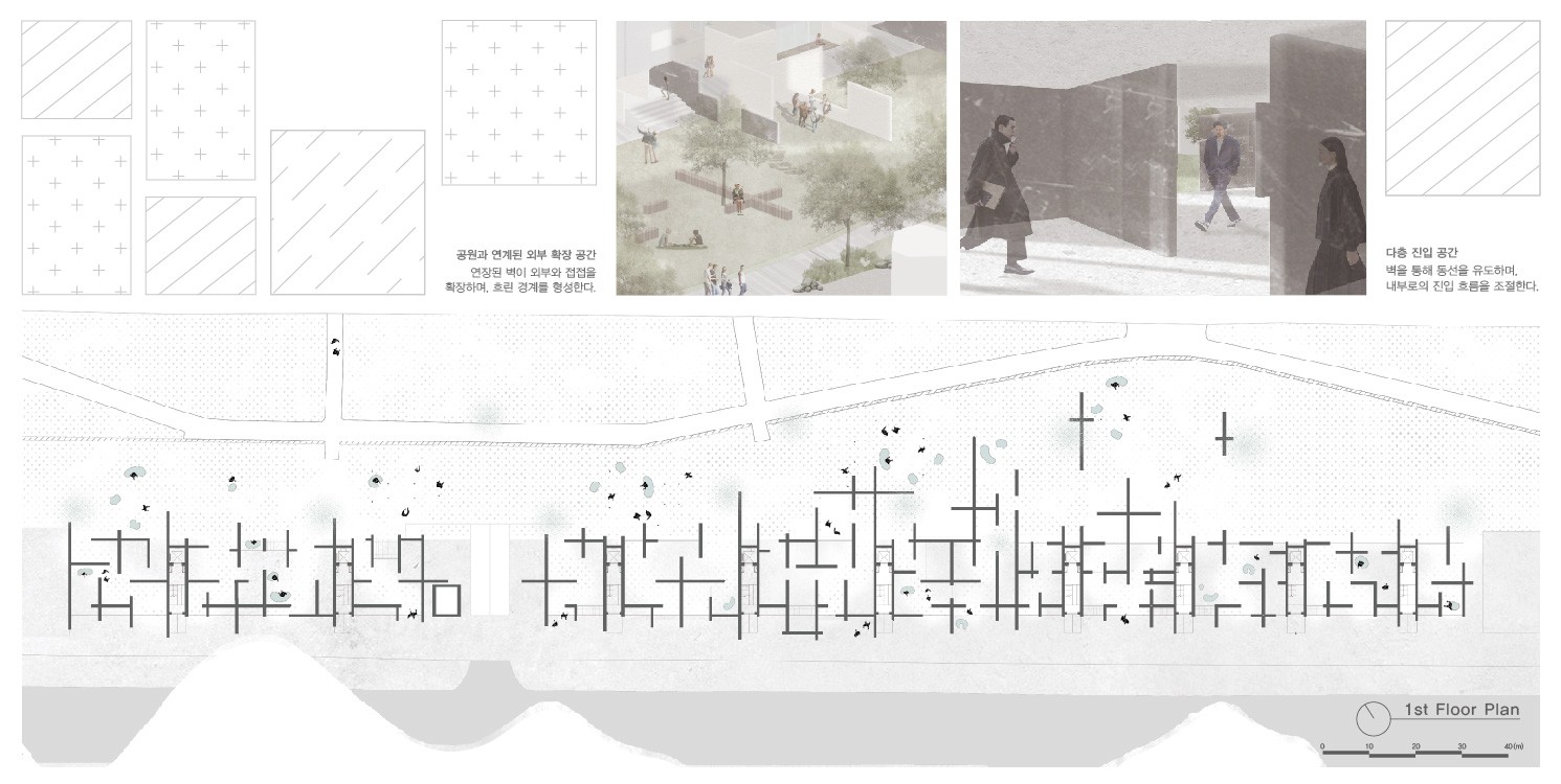 시간이 흐르며 도시의 질서가 바뀔 때, 기능적이었던 건축도 도시에 반응하지 못한 채 고립된다. 과거의 질서를 고수하며 주변과 단절된 건축은 결국 도시의 흐름을 막는 '역-장애' 요소로 전환된다. 이 설계는 단절을 해체하지 않고, 그 경계 위에 흐름을 접속시킨다. 질서를 전복하지 않으면서도, 열린 결말을 위한 새로운 틀을 만든다.